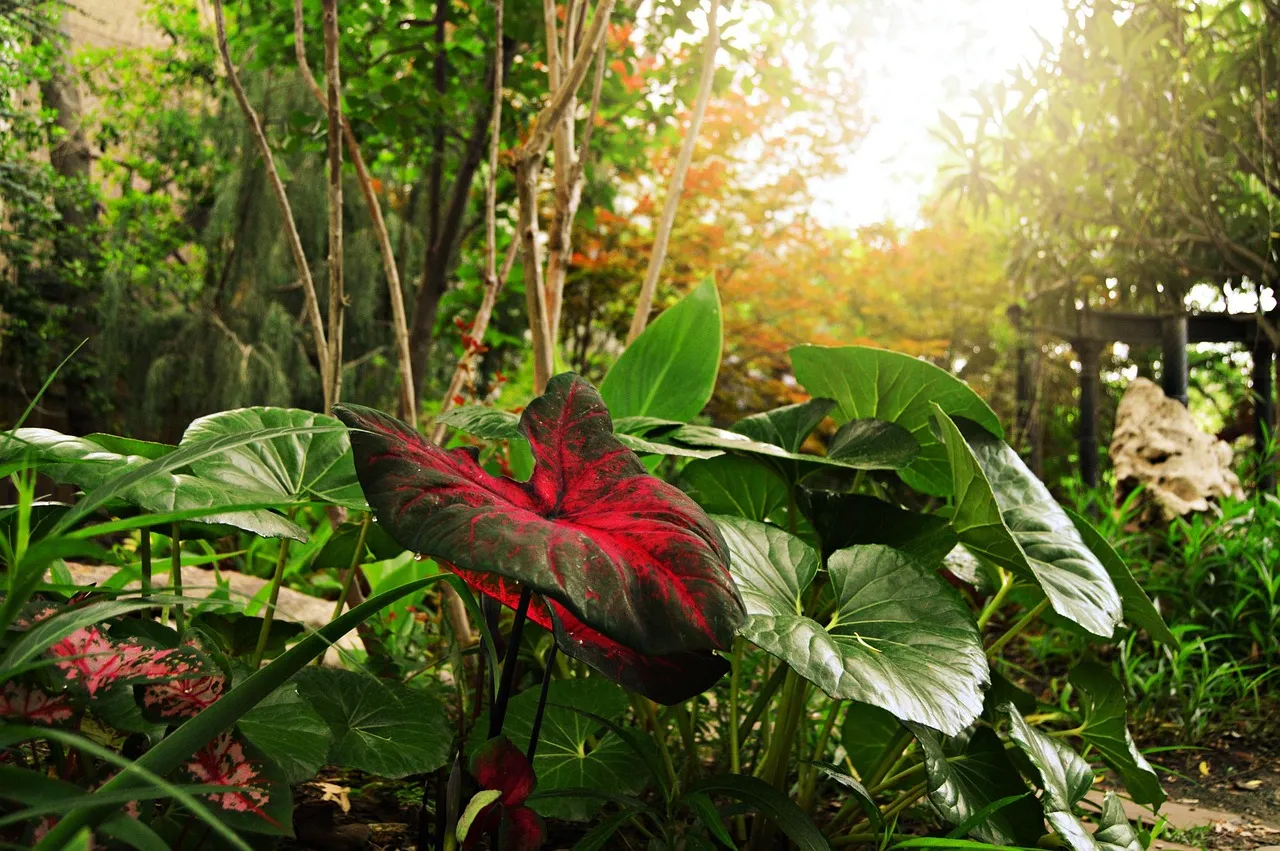 넓고 화려한 잎을 가진 칼라디움은 고온다습한 환경을 좋아해 여름철이나 장마철에 잘 자랍니다. 빗방울에 닿을수록 선명해지는 잎 색은 장식 효과를 극대화해 줍니다.