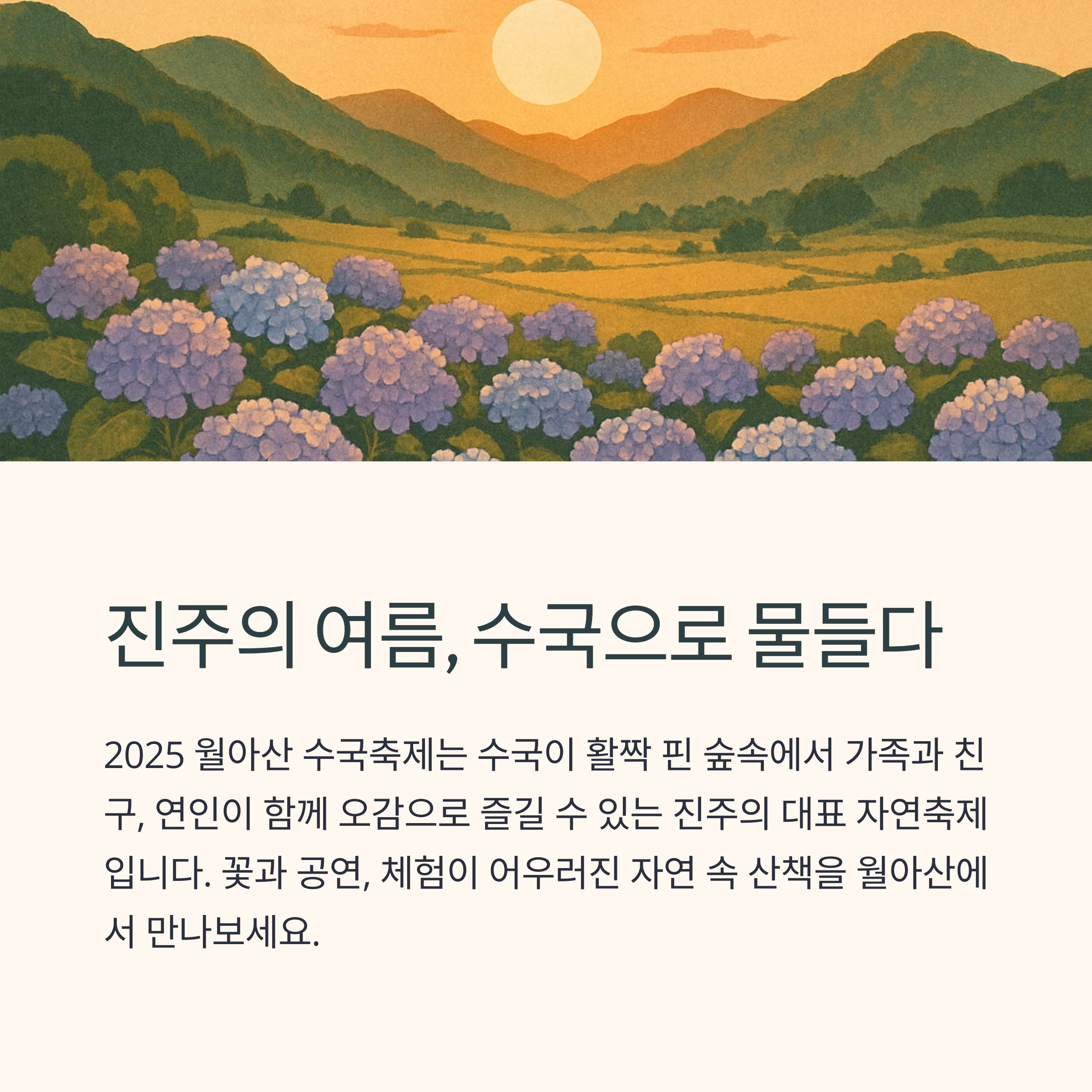 2025 월아산 수국축제는 수국이 활짝 핀 숲속에서 가족과 친구, 연인이 함께 오감으로 즐길 수 있는 진주 대표 자연축제입니다.
