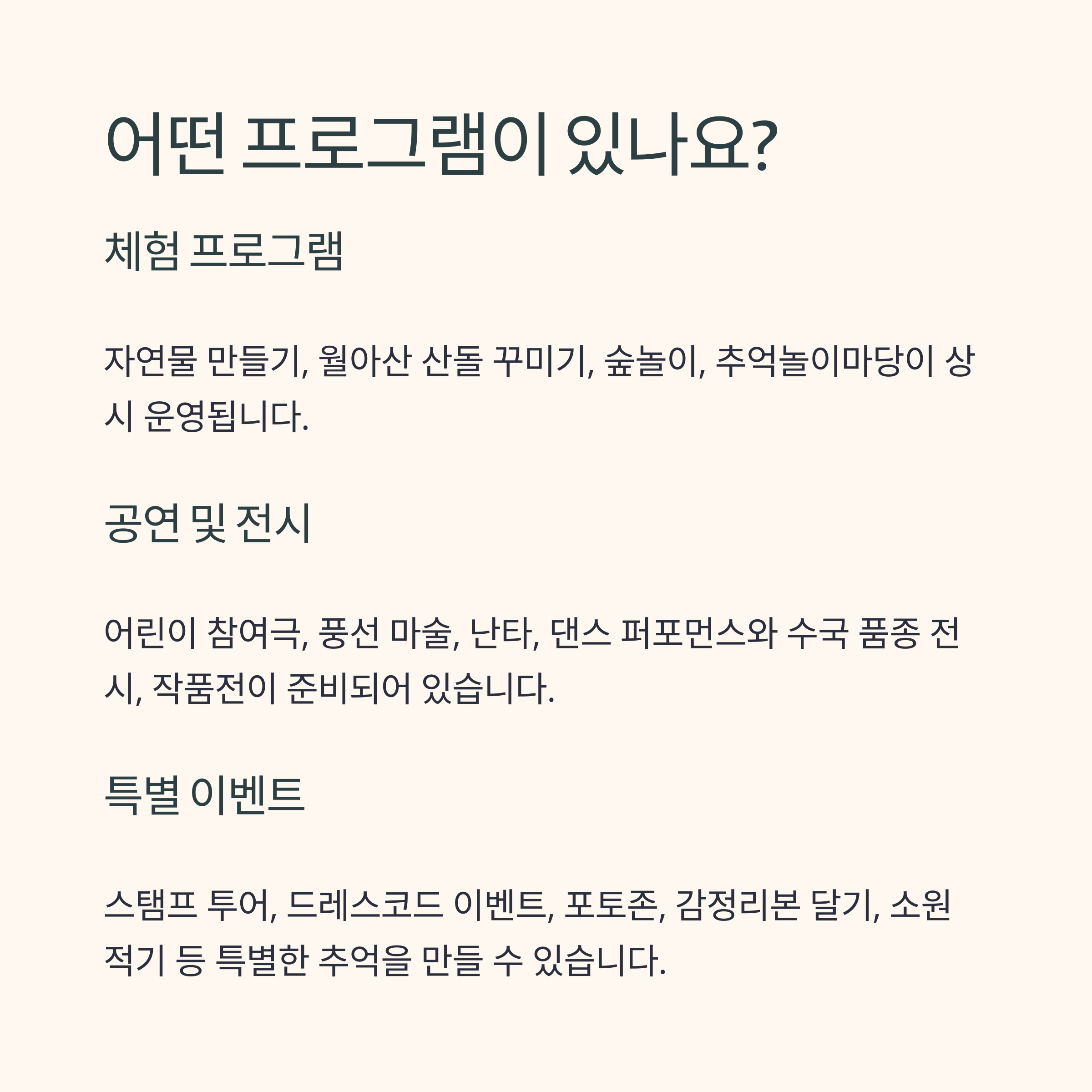 | 프로그램 | 체험(공예·자연물·놀이), 공연, 전시, 부대행사, 포토존 등 |