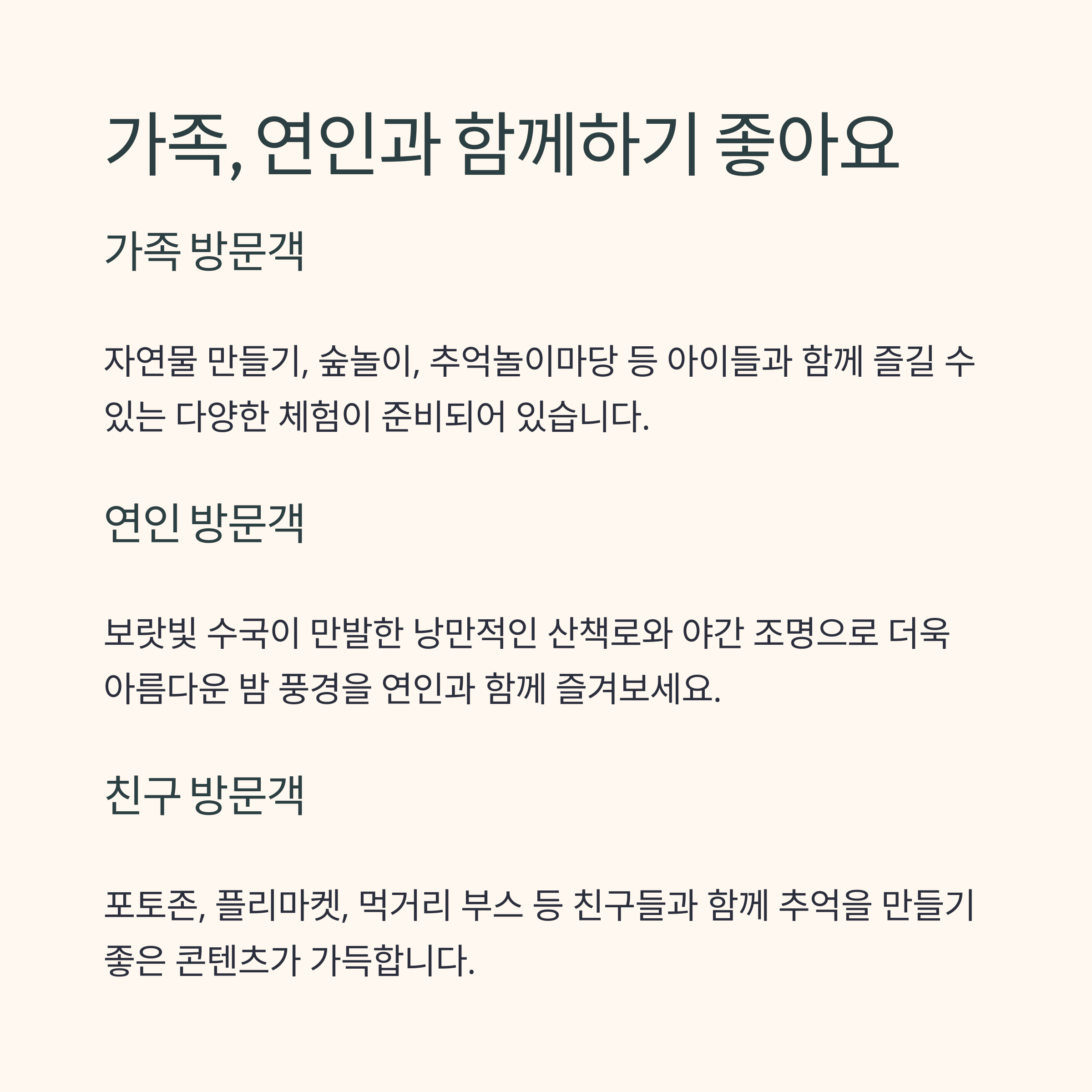 - 가족 단위, 아이 동반 방문객에게 최적화된 프로그램 다수