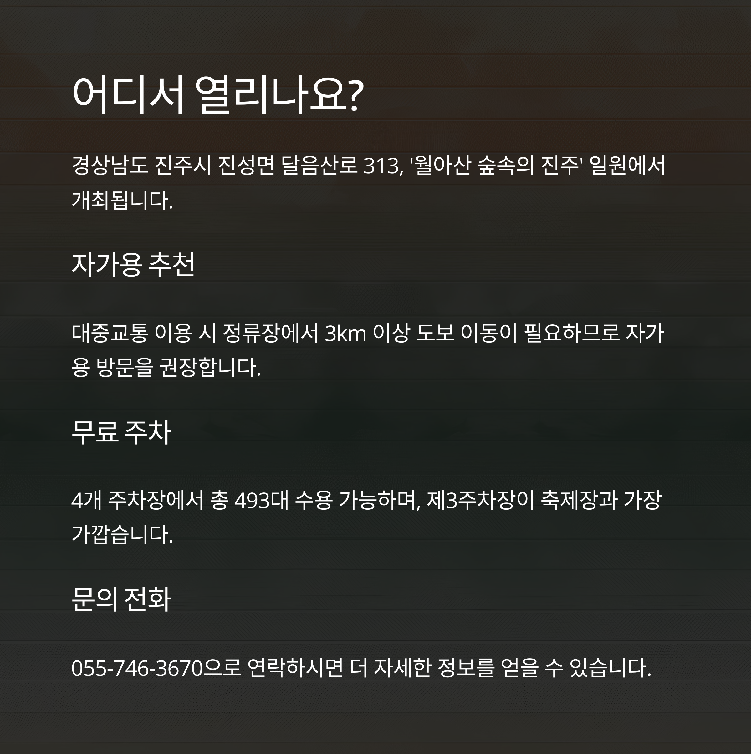 | 주차 | 4개 주차장, 총 493대(무료), 제3주차장 축제장과 가장 가까움 |