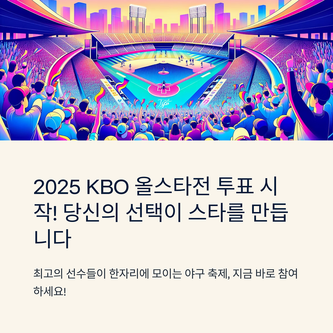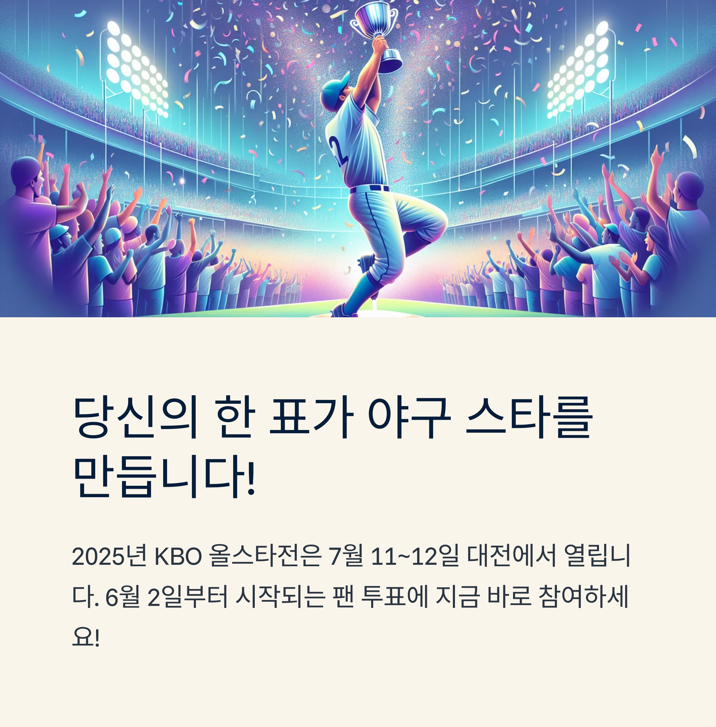 2025년 KBO 올스타전은 7월 11~12일 대전에서 열리며, 6월 2일부터 시작되는 팬 투표에 누구나 참여할 수 있습니다. 팬들의 손으로 뽑는 야구 최고의 별들! 지금 바로 참여하고, 예매도 잊지 마세요
