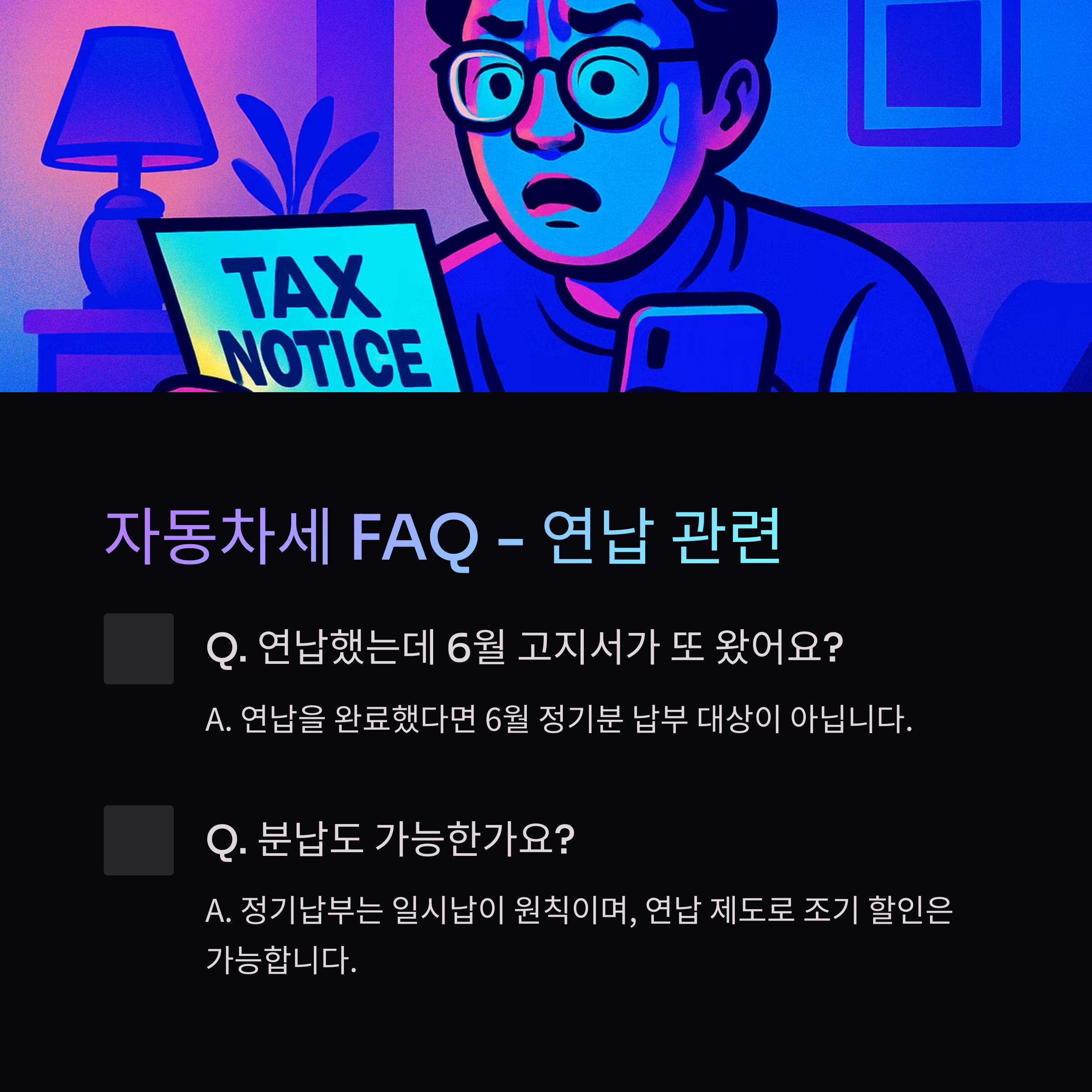 A1. 아닙니다. 연납(선납)을 완료했다면 6월 정기분 고지에서 제외됩니다.