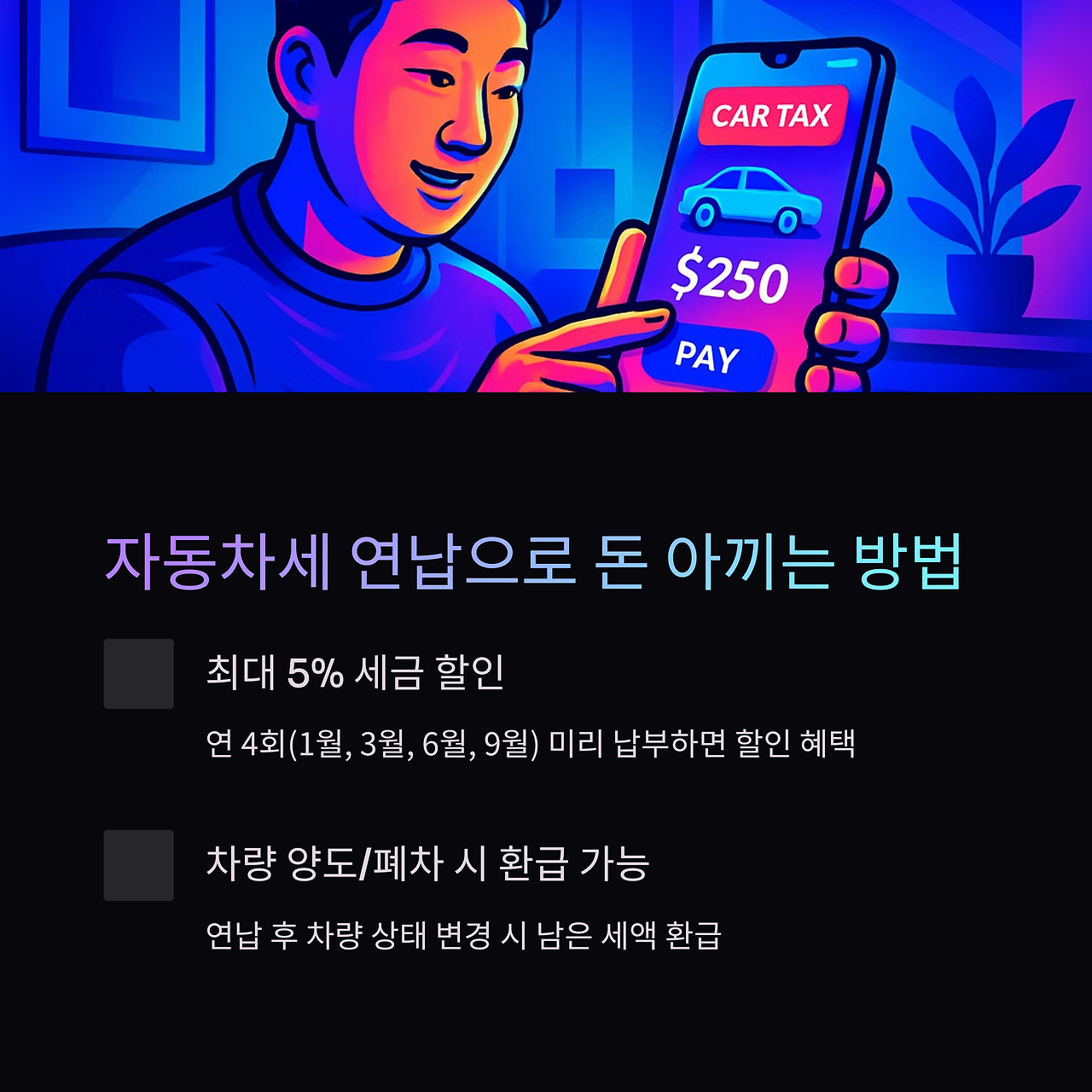 - 연납 후 차량을 양도하거나 폐차할 경우 남은 세액을 환급받을 수 있습니다.