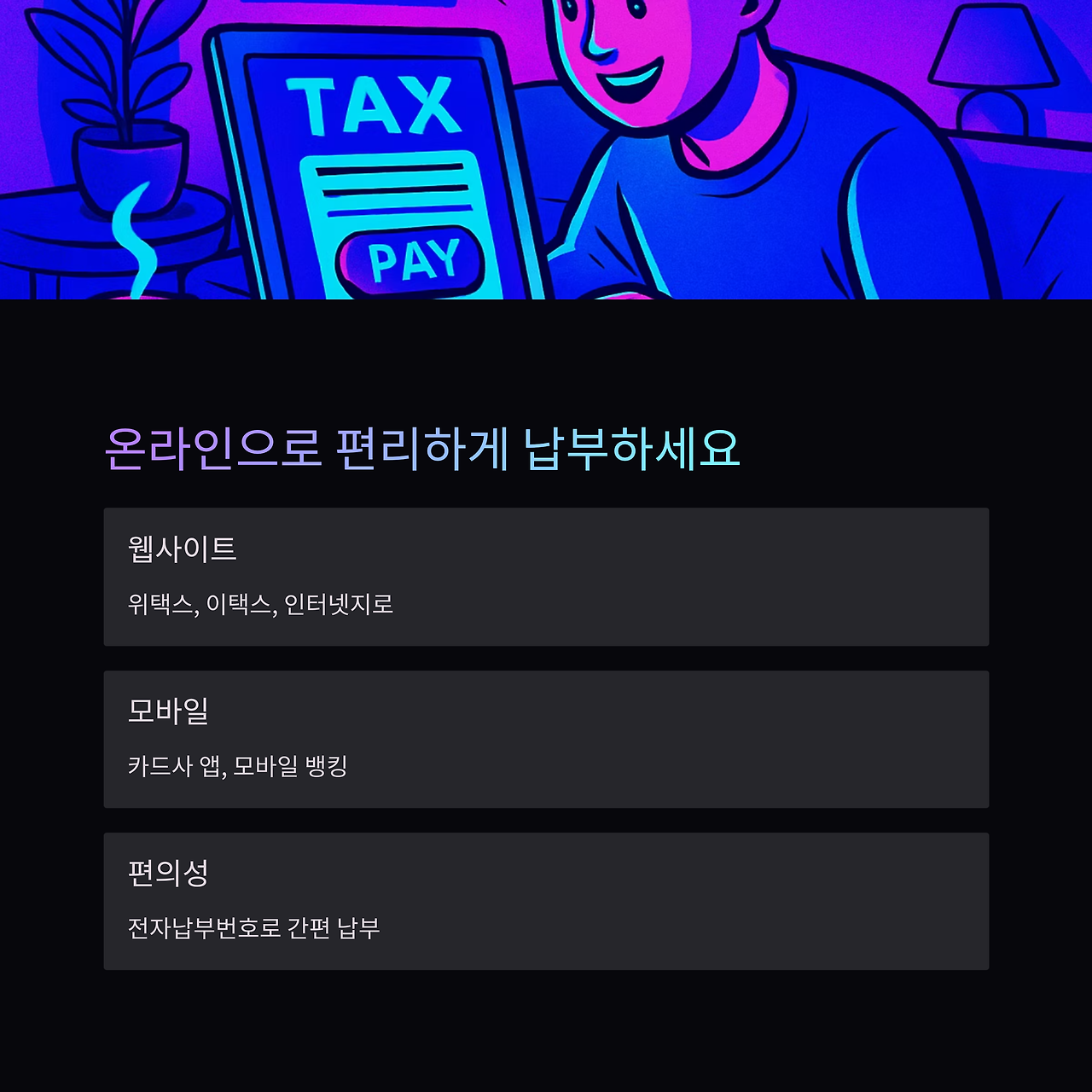 | 오프라인 | 은행 창구, ATM, 지자체 세무과 방문 등 |