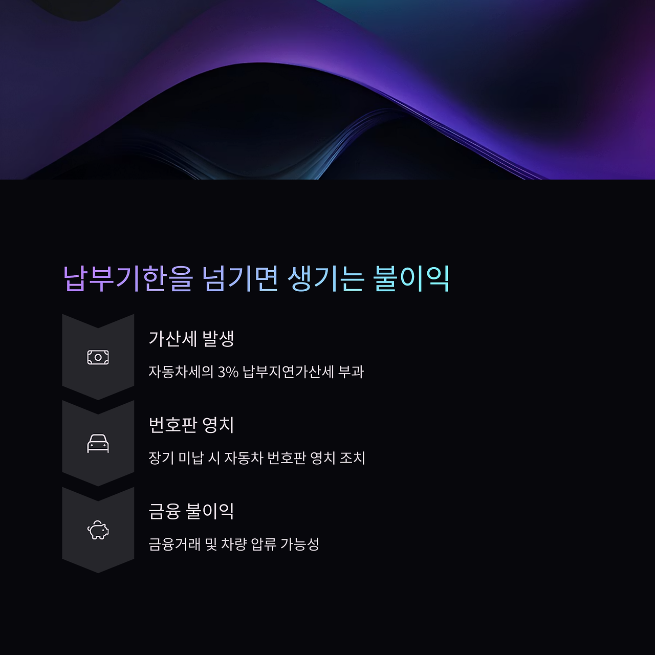 예) 자동차세 100만 원 → 미납 시 3만 원 추가 = 총 103만 원 납부 - 장기 미납 시 불이익