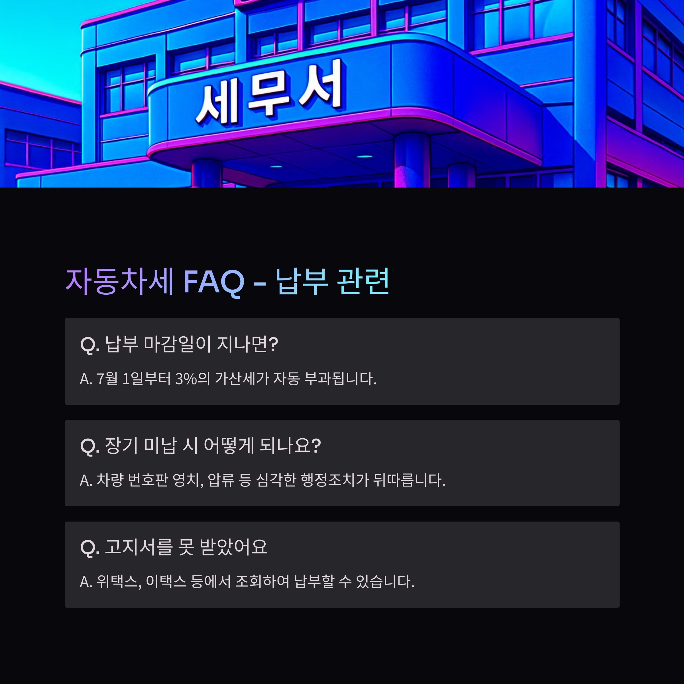 A2. 7월 1일부터 3%의 가산세가 자동 부과되며, 장기 미납 시 차량에 대한 불이익이 따릅니다.