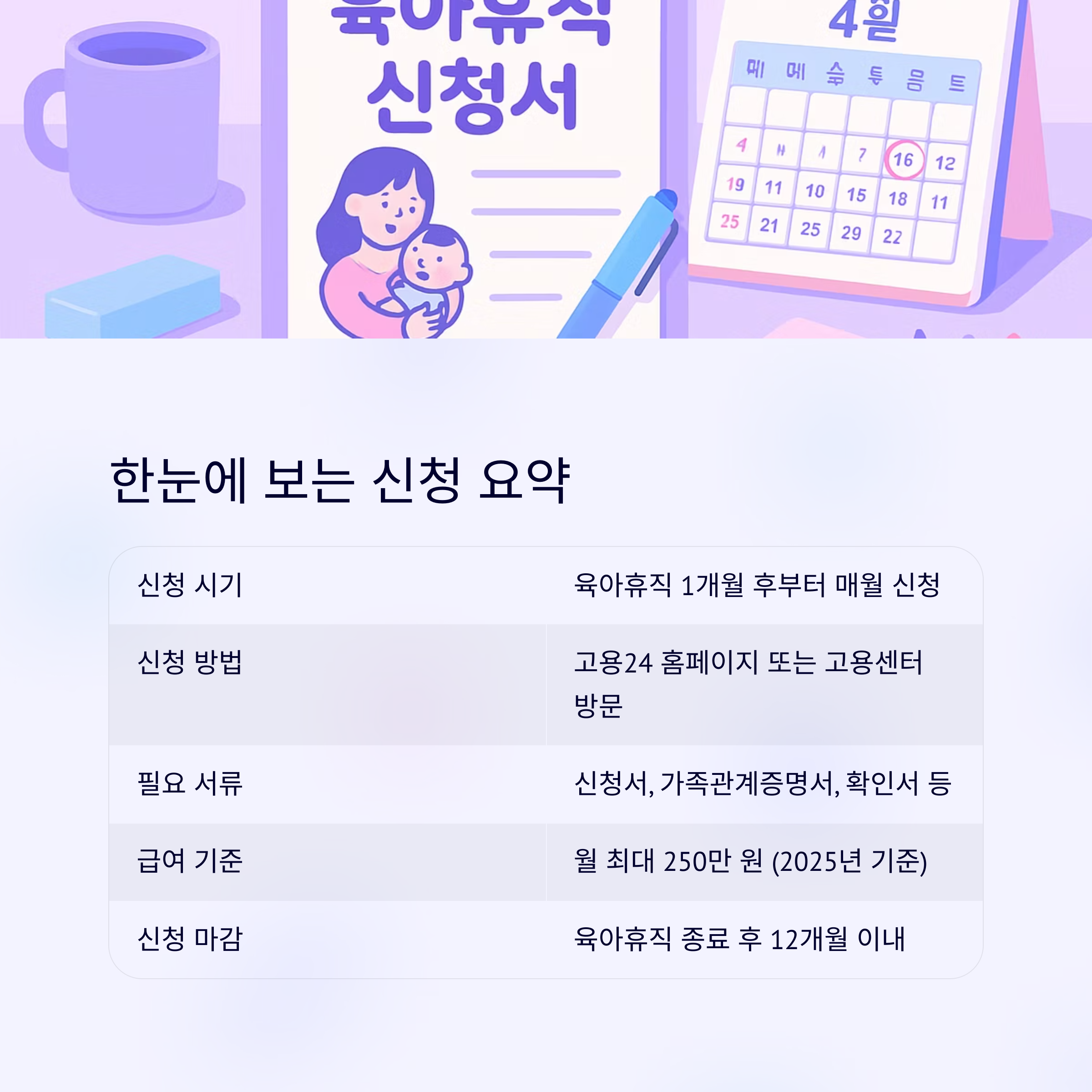 | 신청 시기 | 육아휴직 1개월 후부터 매월 신청 |