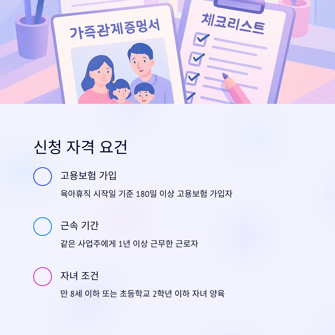기본적인 고용보험 가입 기간, 근속 기간, 자녀 조건을 모두 충족해야만 신청이 가능합니다.