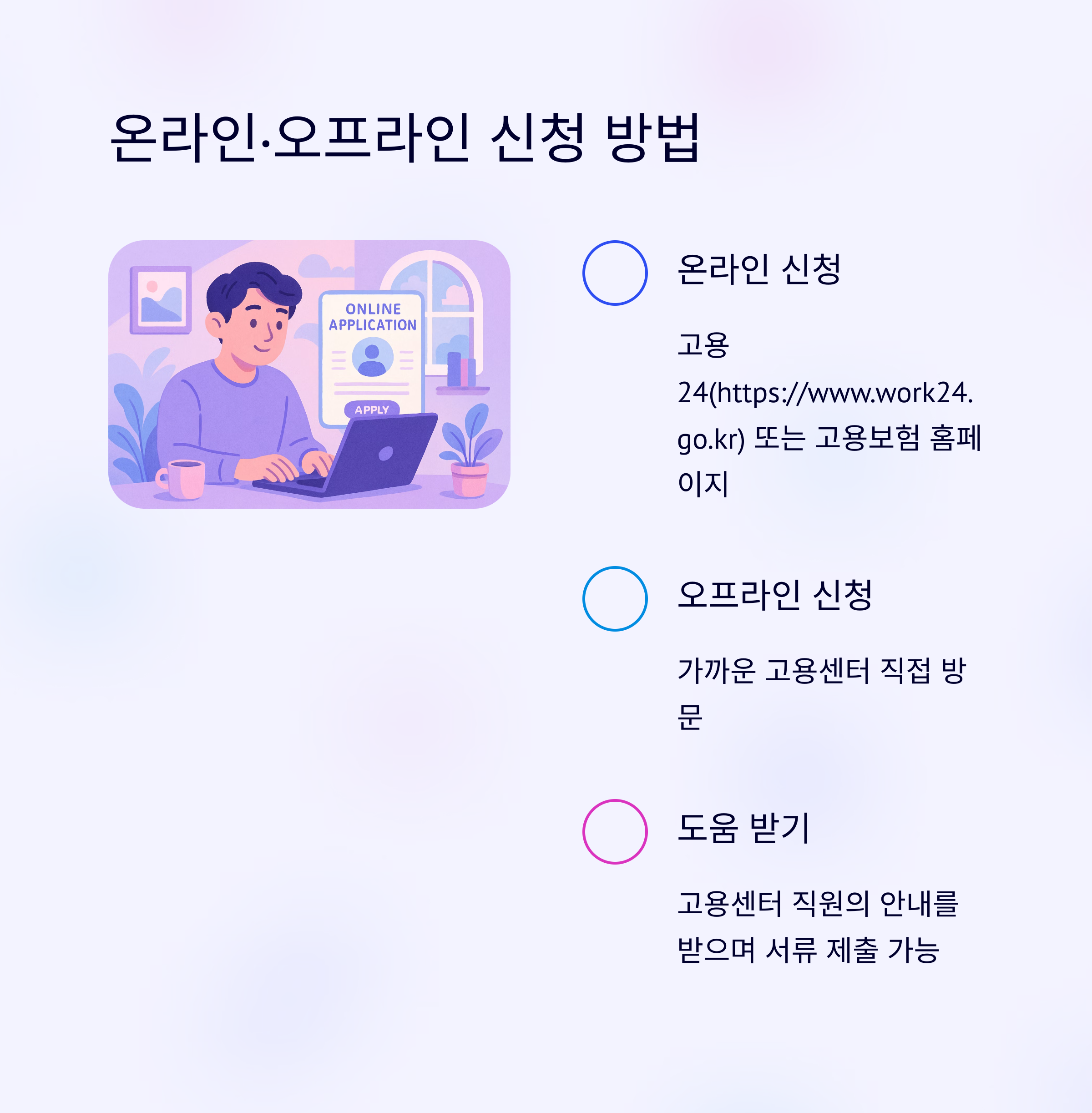 - 고용24(https://www.work24.go.kr) 또는 고용보험 홈페이지에서 신청