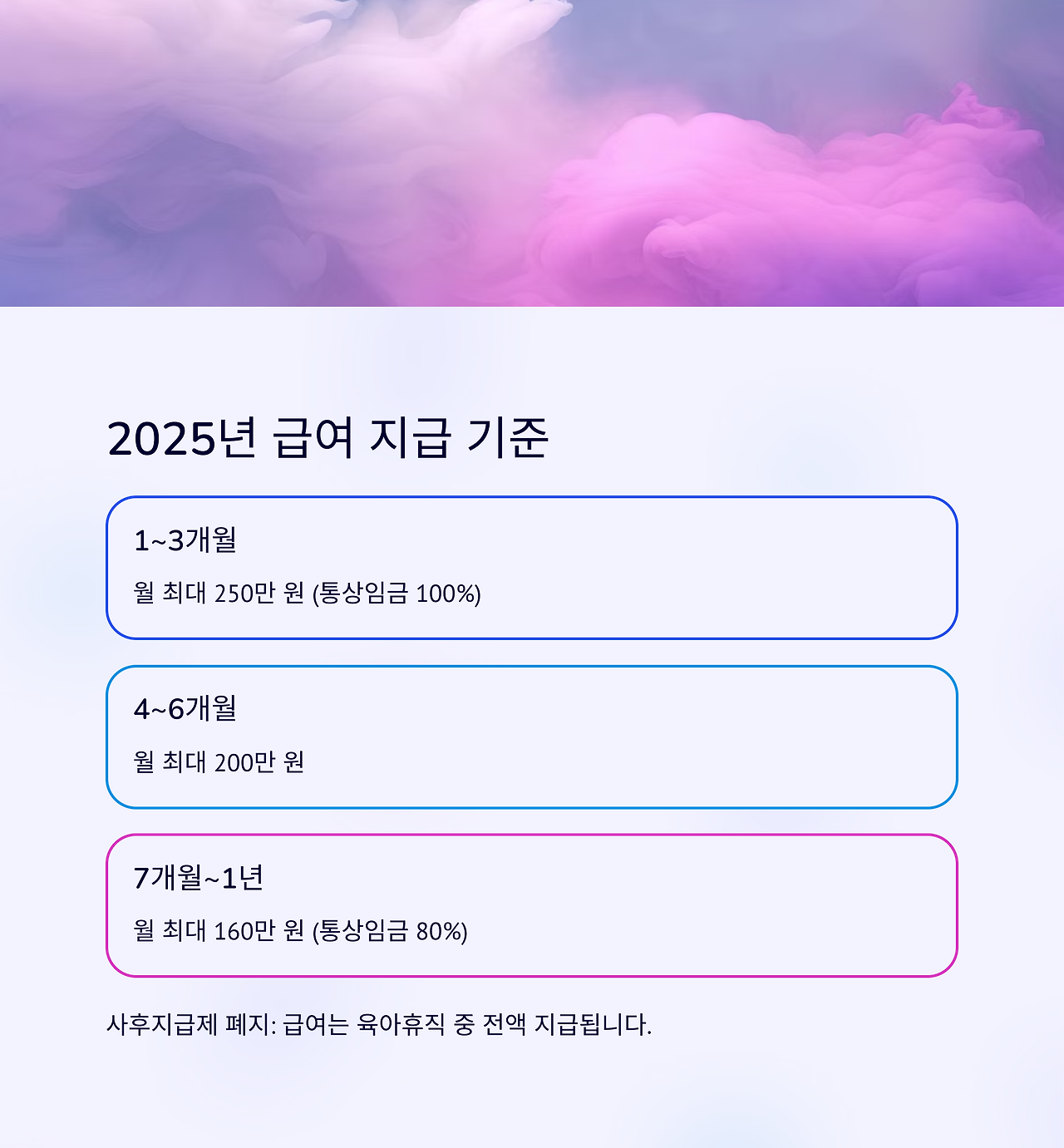 - 사후지급제 폐지: 급여는 육아휴직 중 전액 지급