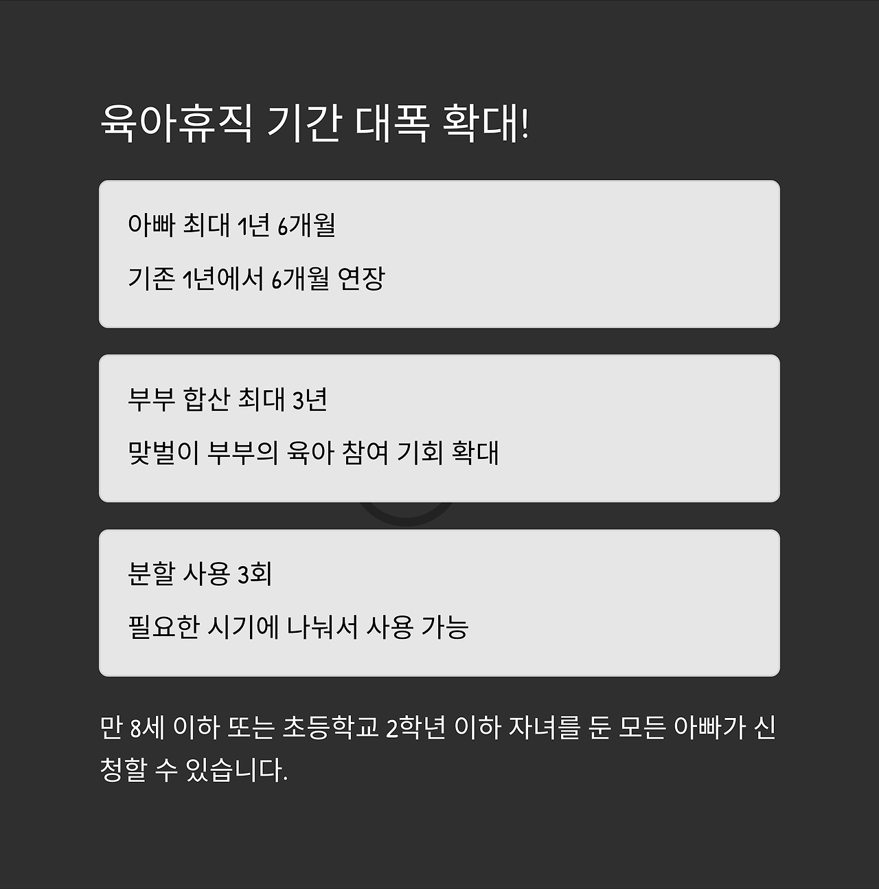 - 기존 1년에서 6개월 연장된 것으로, 맞벌이 부부라면 엄마 1년 6개월, 아빠 1년 6개월로 나눠 쓸 수 있습니다.