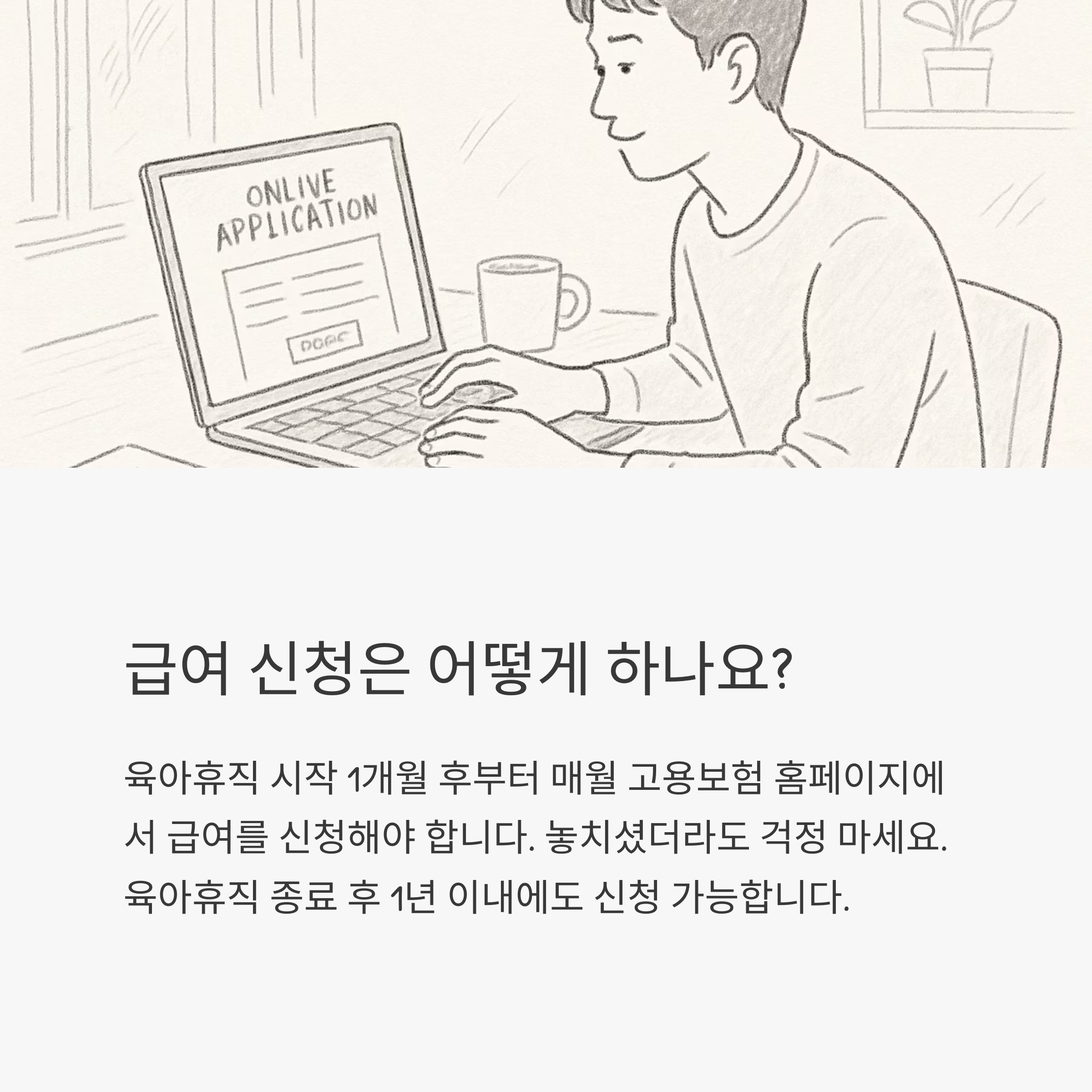 - 육아휴직 시작 1개월 후부터 매월 고용보험 홈페이지에서 별도 신청, 종료 후 1년 이내 신청 가능.