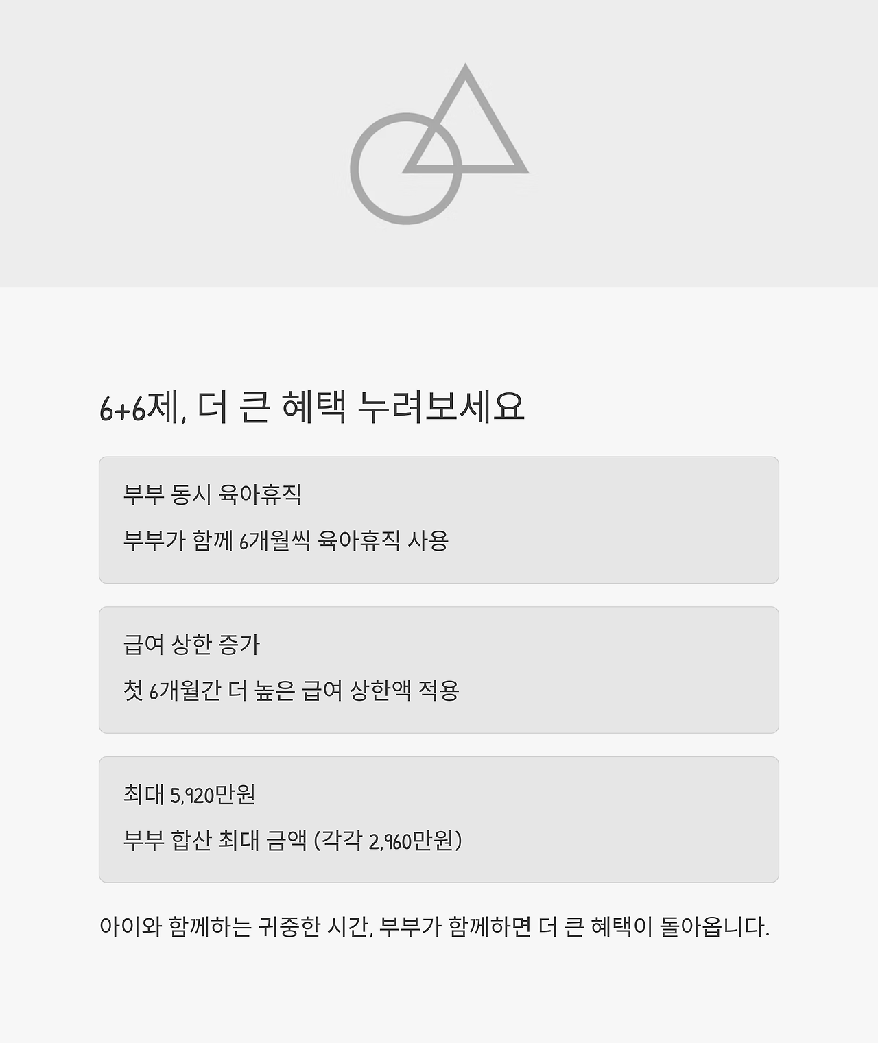 - 부부가 동시에 육아휴직을 쓰는 6+6제의 경우, 첫 6개월간 급여 상한이 더 올라 부부 각각 1년간 최대 2,960만 원, 합산 5,920만 원까지 받을 수 있습니다.