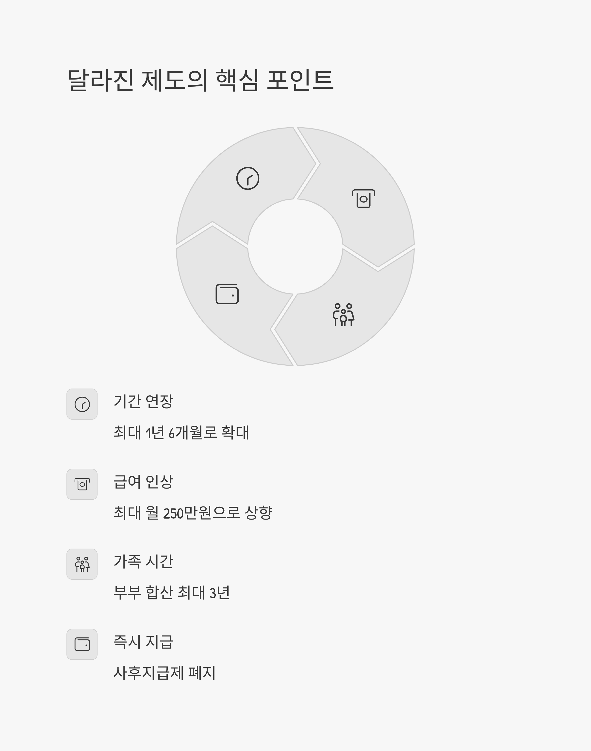 - 부부가 순차적으로 육아휴직을 쓸 때 두 번째 사용자인 아빠에게 인센티브(추가 급여) 지급.