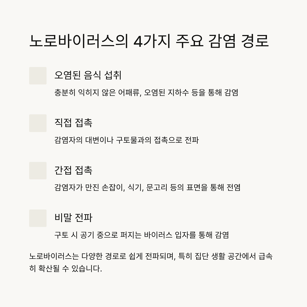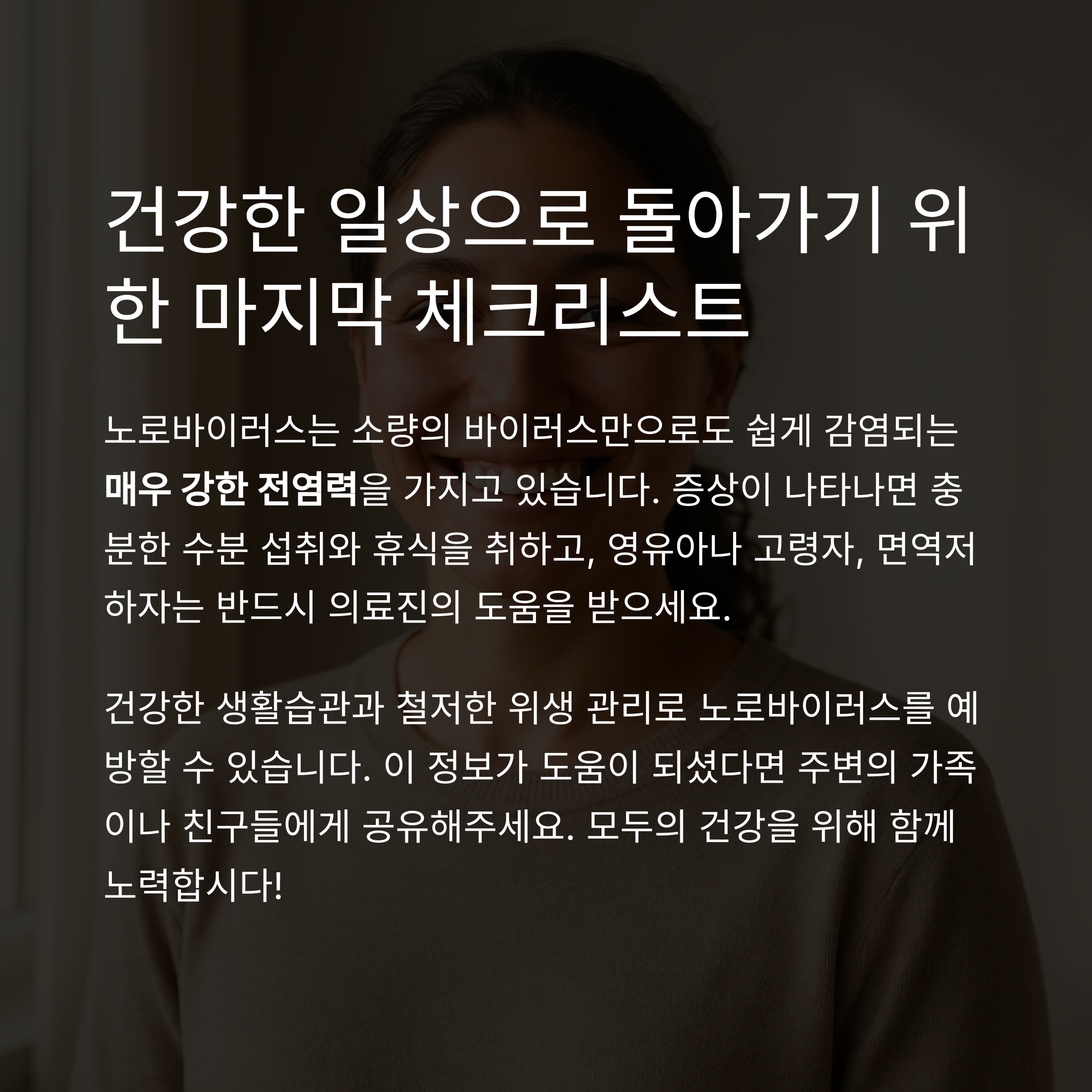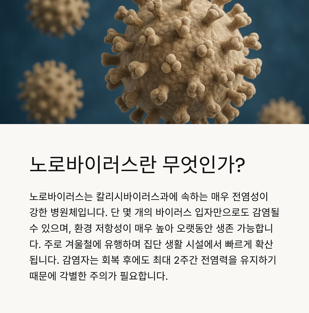 ※ 단 몇 개의 바이러스 입자만으로도 감염될 수 있으며, 회복 후 2주간 전염력이 지속됩니다.