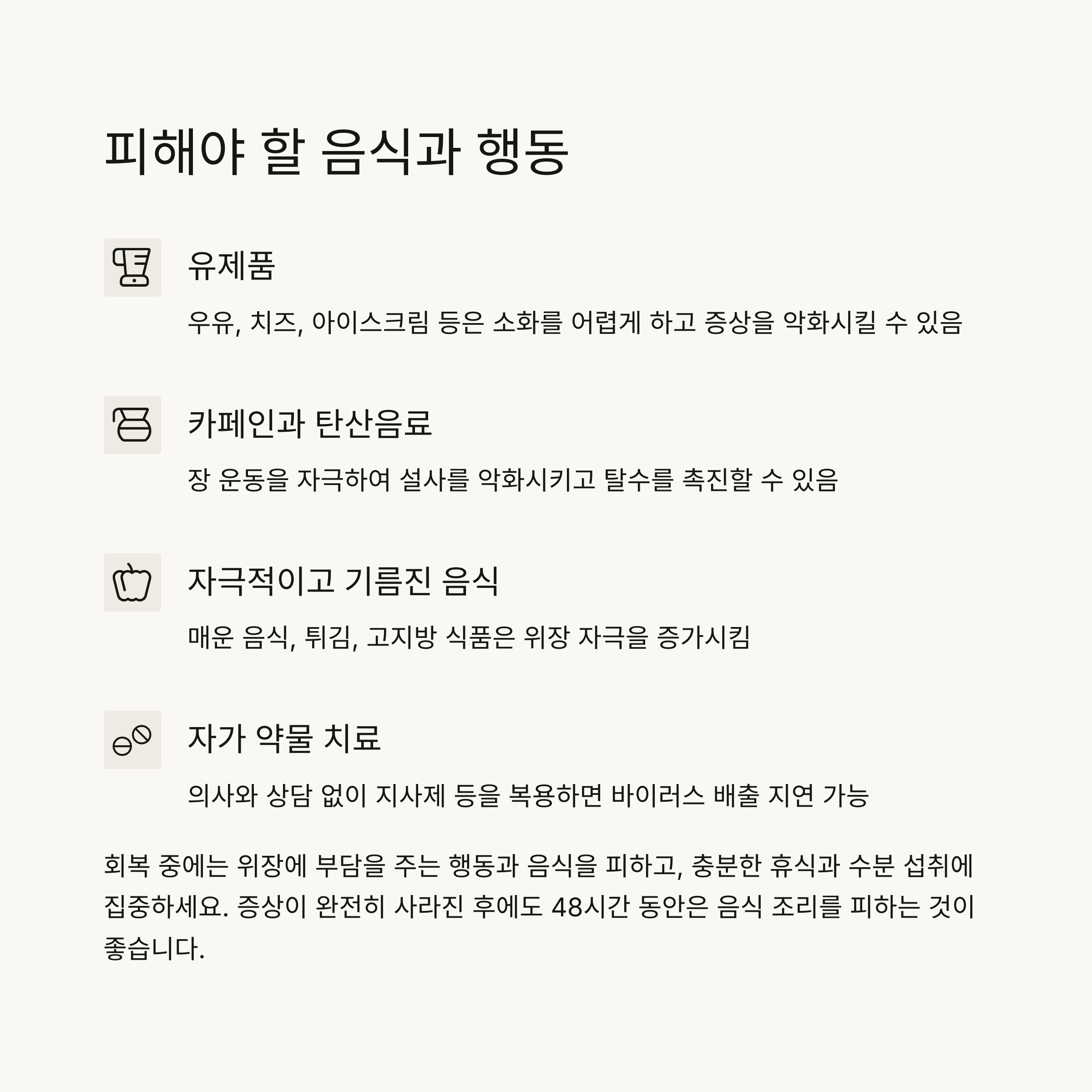 - 주의 음식: 유제품, 탄산음료, 과일주스, 자극적인 음식은 증상 악화 가능