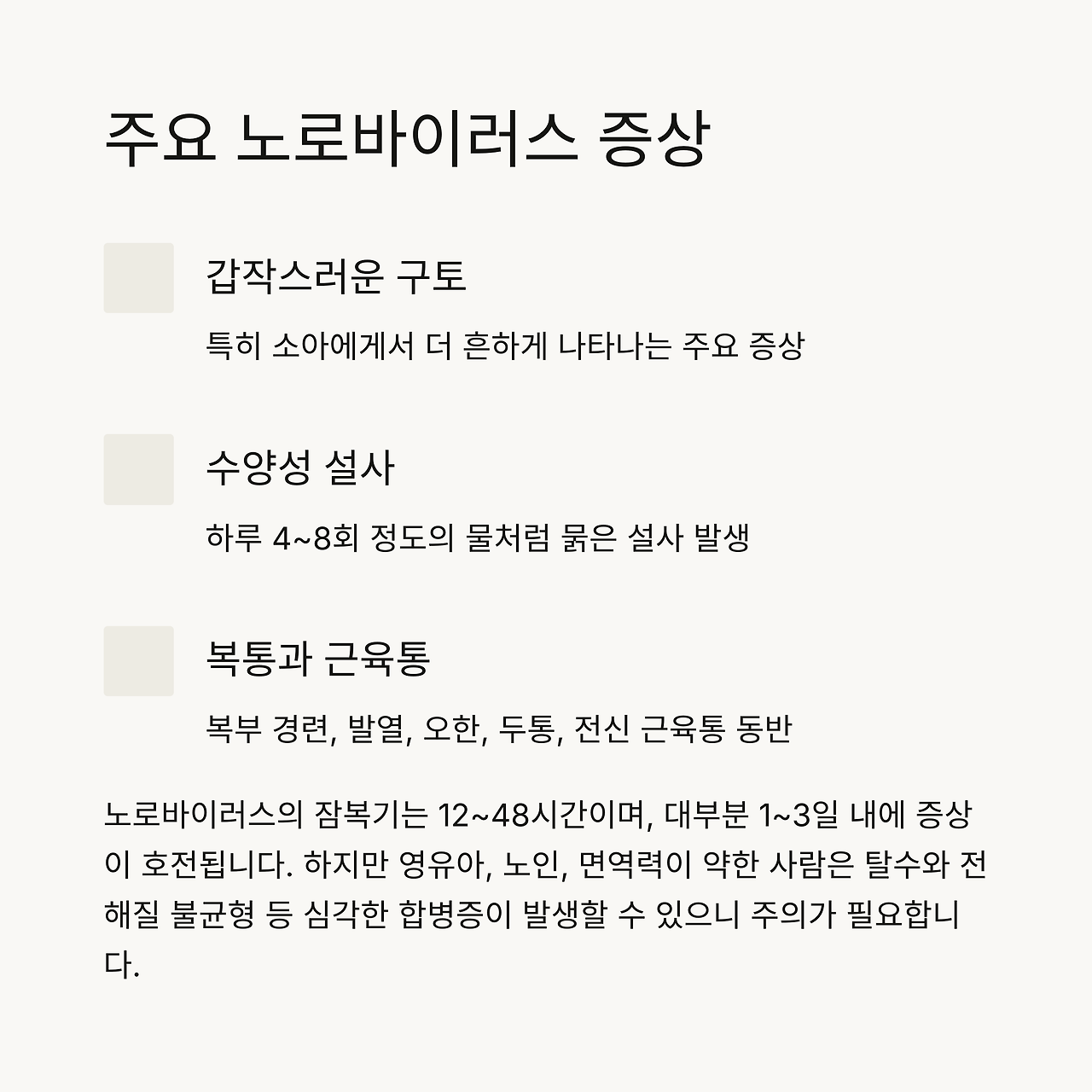 - 대표 노로바이러스 증상: