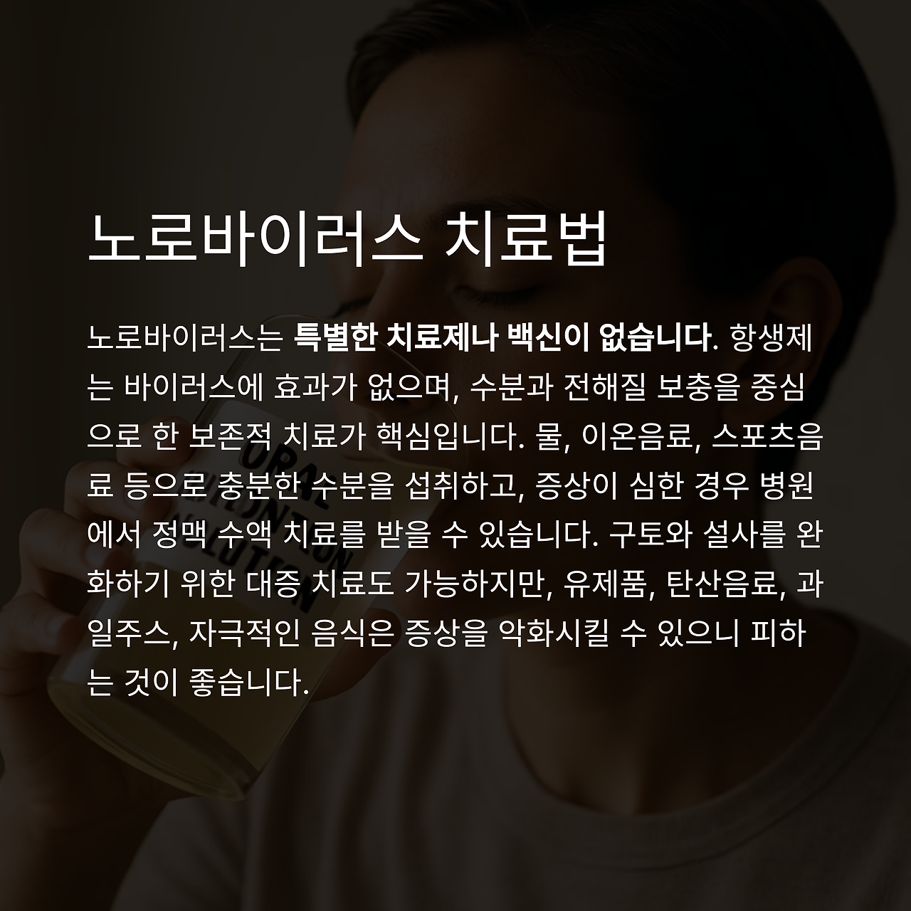 노로바이러스는 특별한 치료제나 백신이 없습니다. 항생제는 효과 없으며, 수분 보충 중심의 보존적 치료가 핵심입니다.