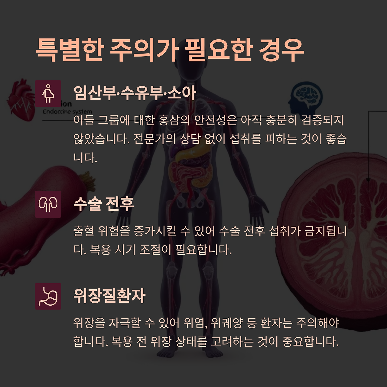 이들 그룹에 대한 홍삼의 안전성은 아직 충분히 검증되지 않았습니다. 전문가의 상담 없이 섭취를 피하는 것이 좋습니다. '홍삼 효능과 부작용' 정보를 참고해 신중히 결정해야 합니다.