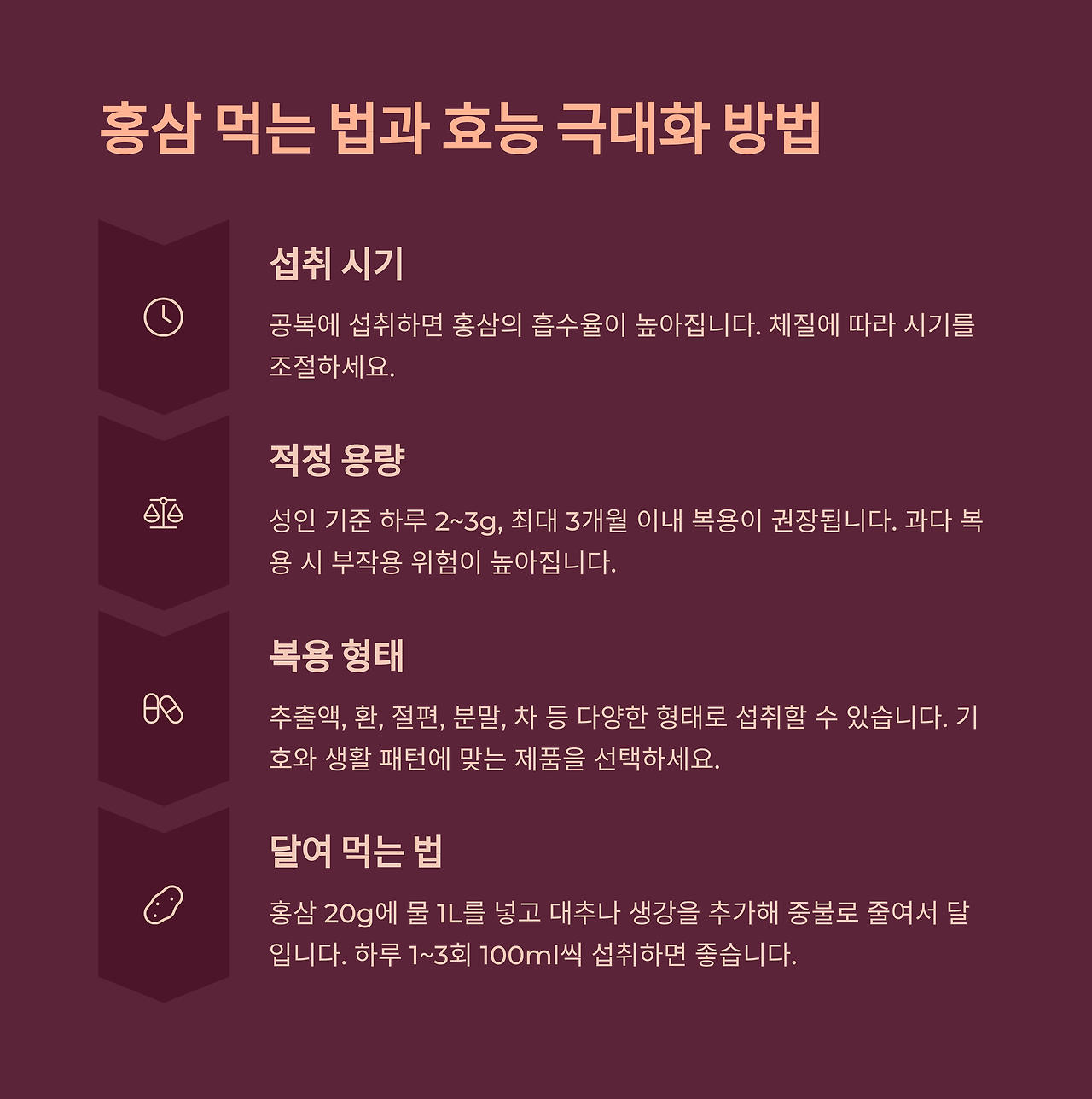 꾸준하고 소량 복용이 가장 효과적입니다. 공복 섭취, 철분 용기 피하기, 수면 전 섭취 자제 등 주의사항을 지켜야 합니다. '홍삼 효능과 부작용'을 반영한 올바른 습관이 중요합니다.