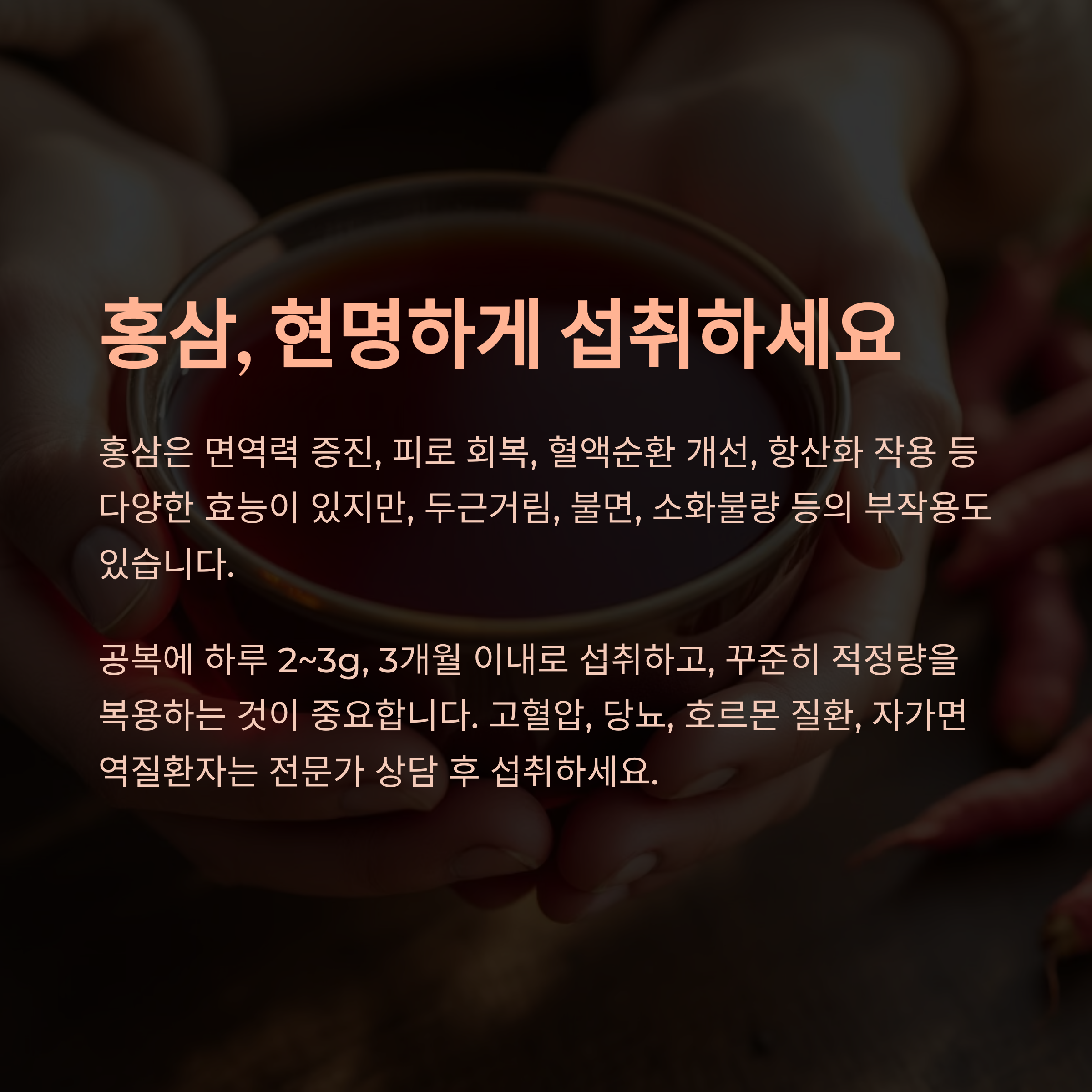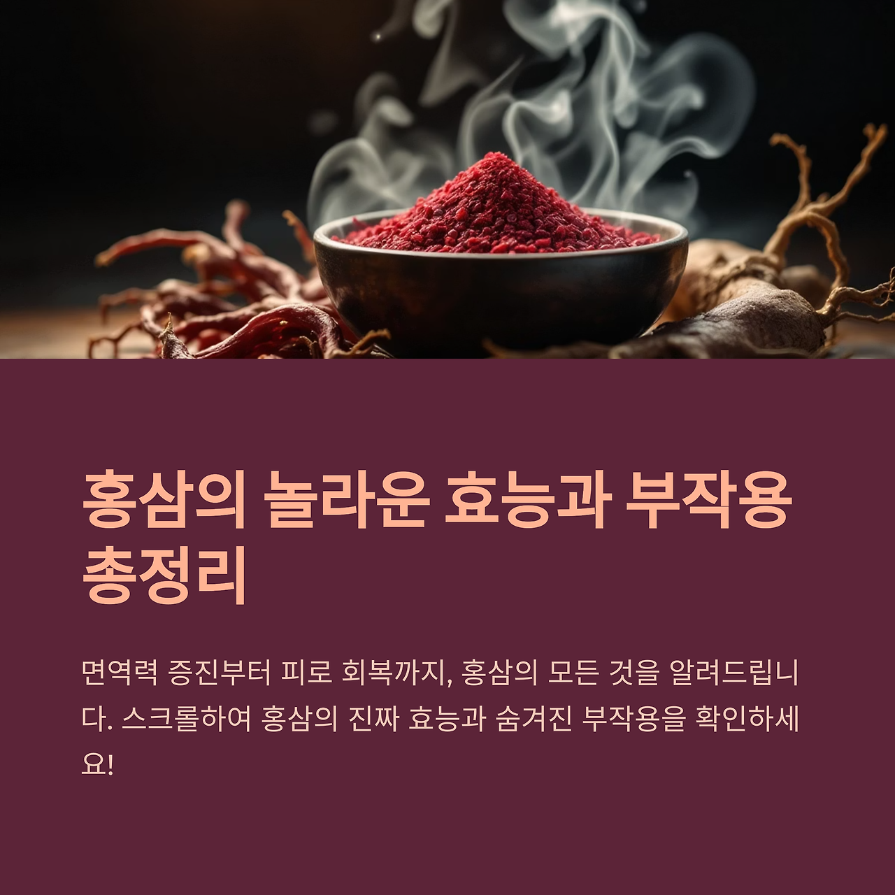 '홍삼 효능과 부작용'에 대한 명확한 이해와 신중한 복용이 건강한 삶으로 이어질 수 있습니다.