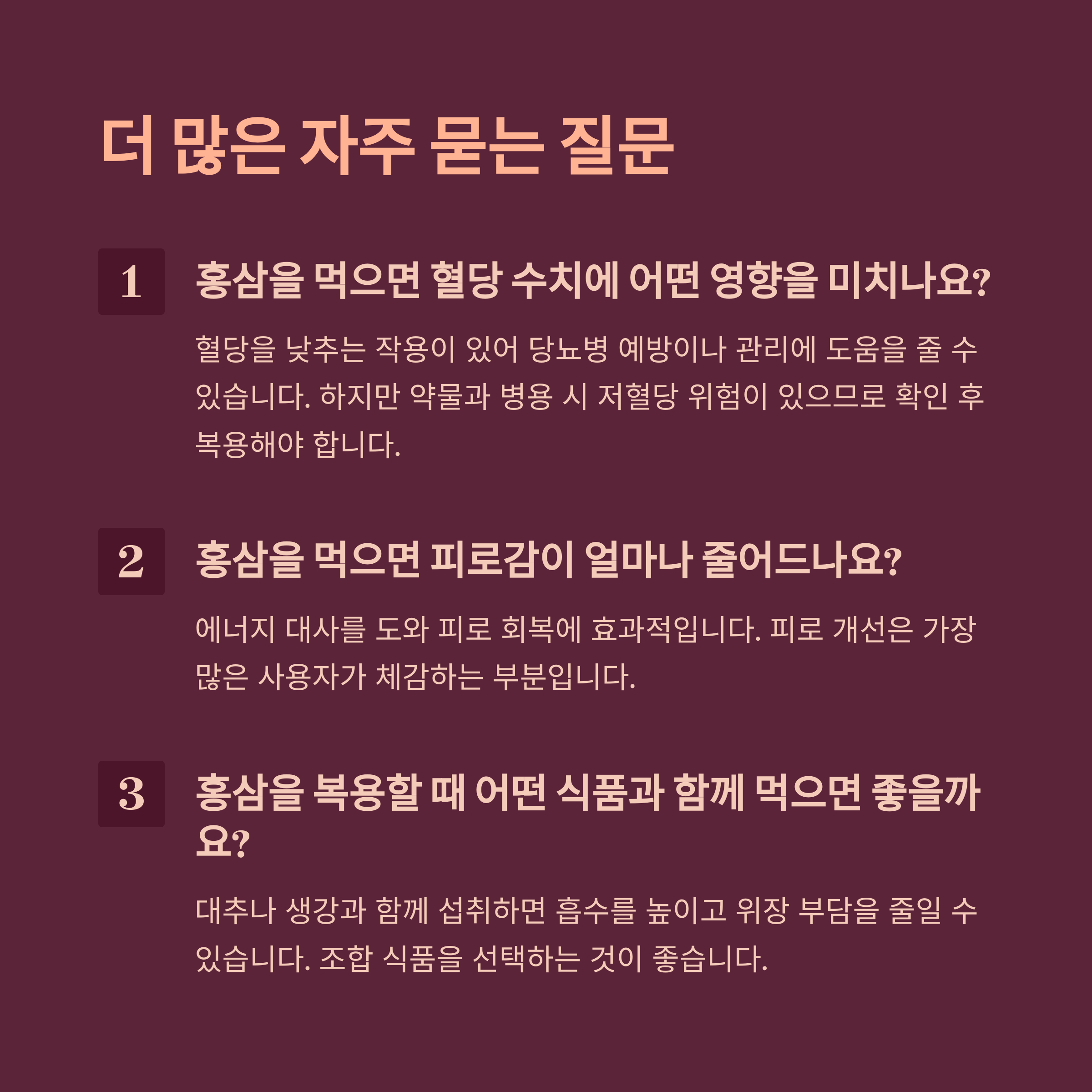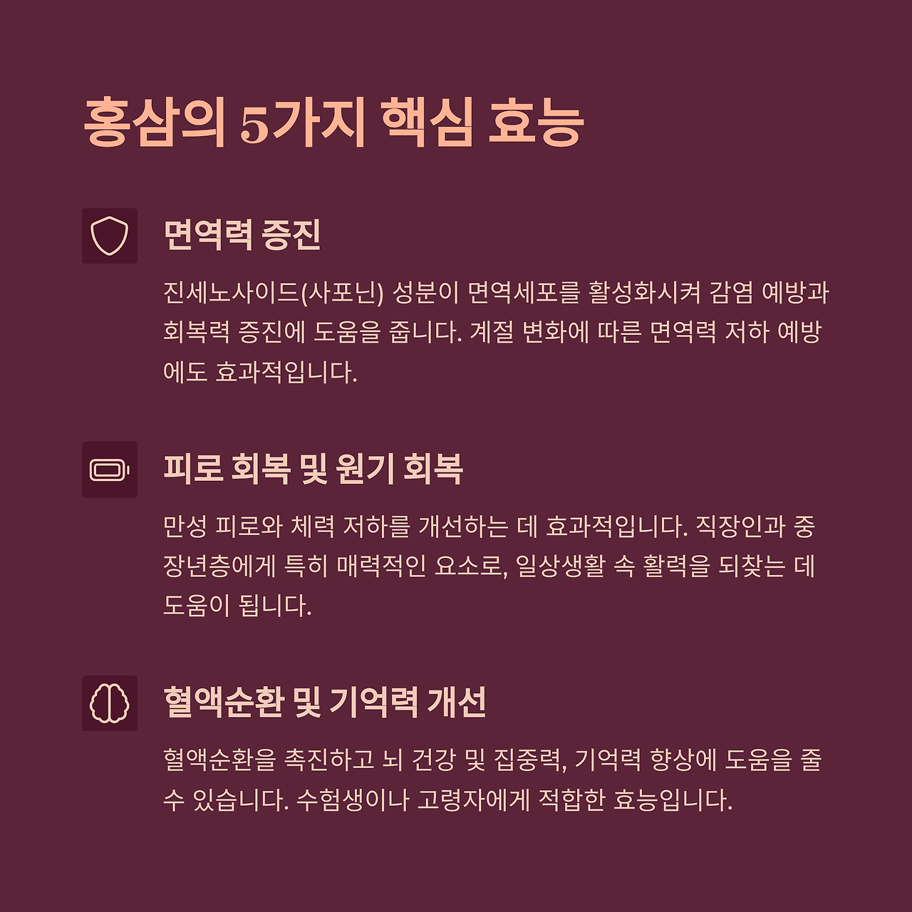 홍삼은 에너지 대사를 도와 피로 회복에 효과적입니다. '홍삼 효능과 부작용'에서 피로 개선은 가장 많은 사용자가 체감하는 부분입니다.
