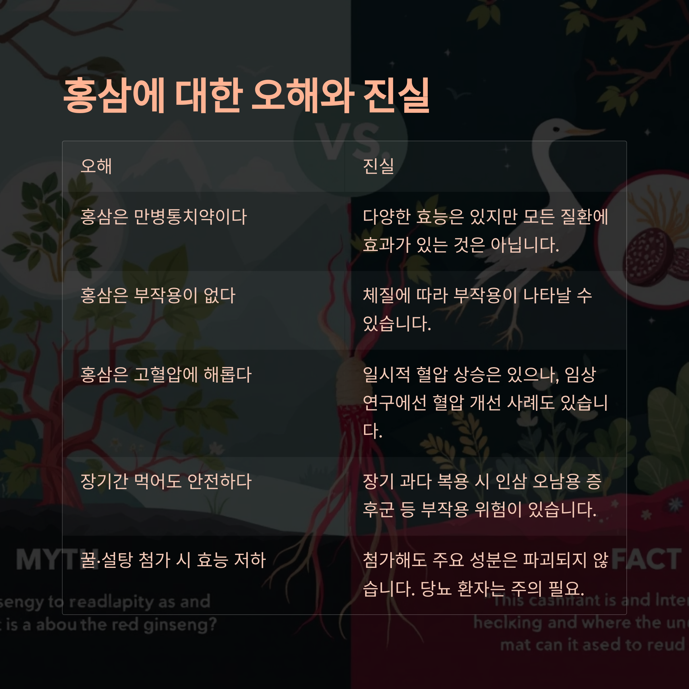 | 홍삼은 만병통치약이다 (오해) | 다양한 효능은 있지만 모든 질환에 효과가 있는 것은 아닙니다. '홍삼 효능과 부작용'에 기반한 섭취가 필요합니다. |