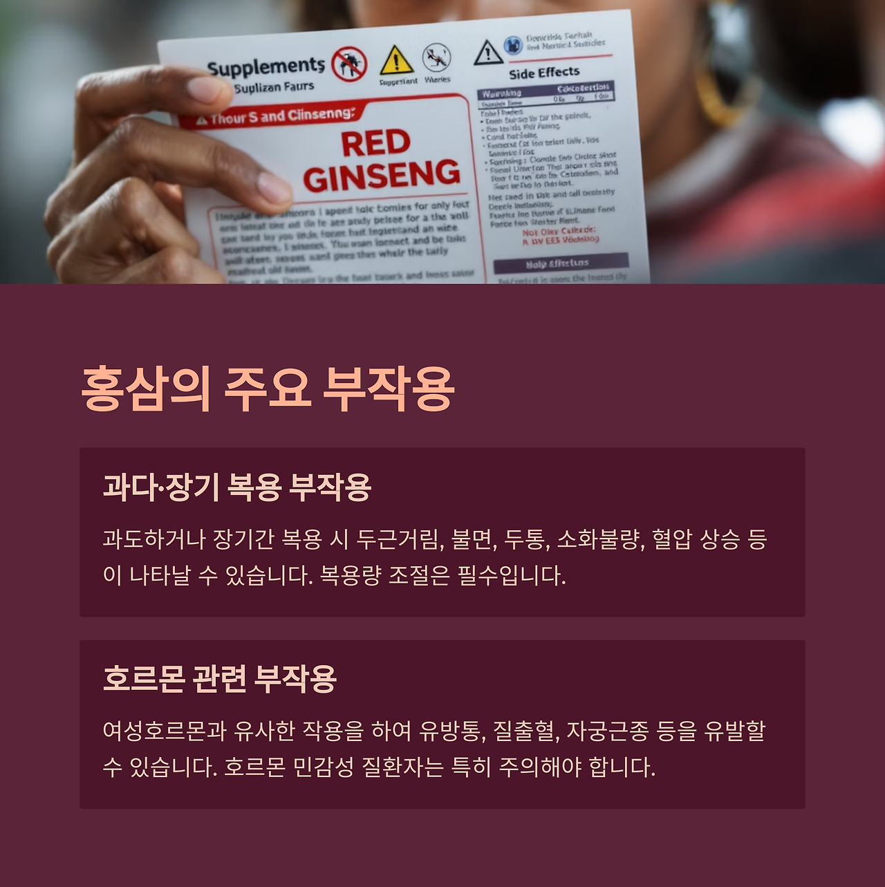 홍삼은 여성호르몬과 유사한 작용을 하여 유방통, 질출혈, 자궁근종 등을 유발할 수 있습니다. 호르몬 민감성 질환자라면 특히 '홍삼 효능과 부작용'을 신중히 살펴야 합니다. 복용 전 전문가 상담이 필요합니다.