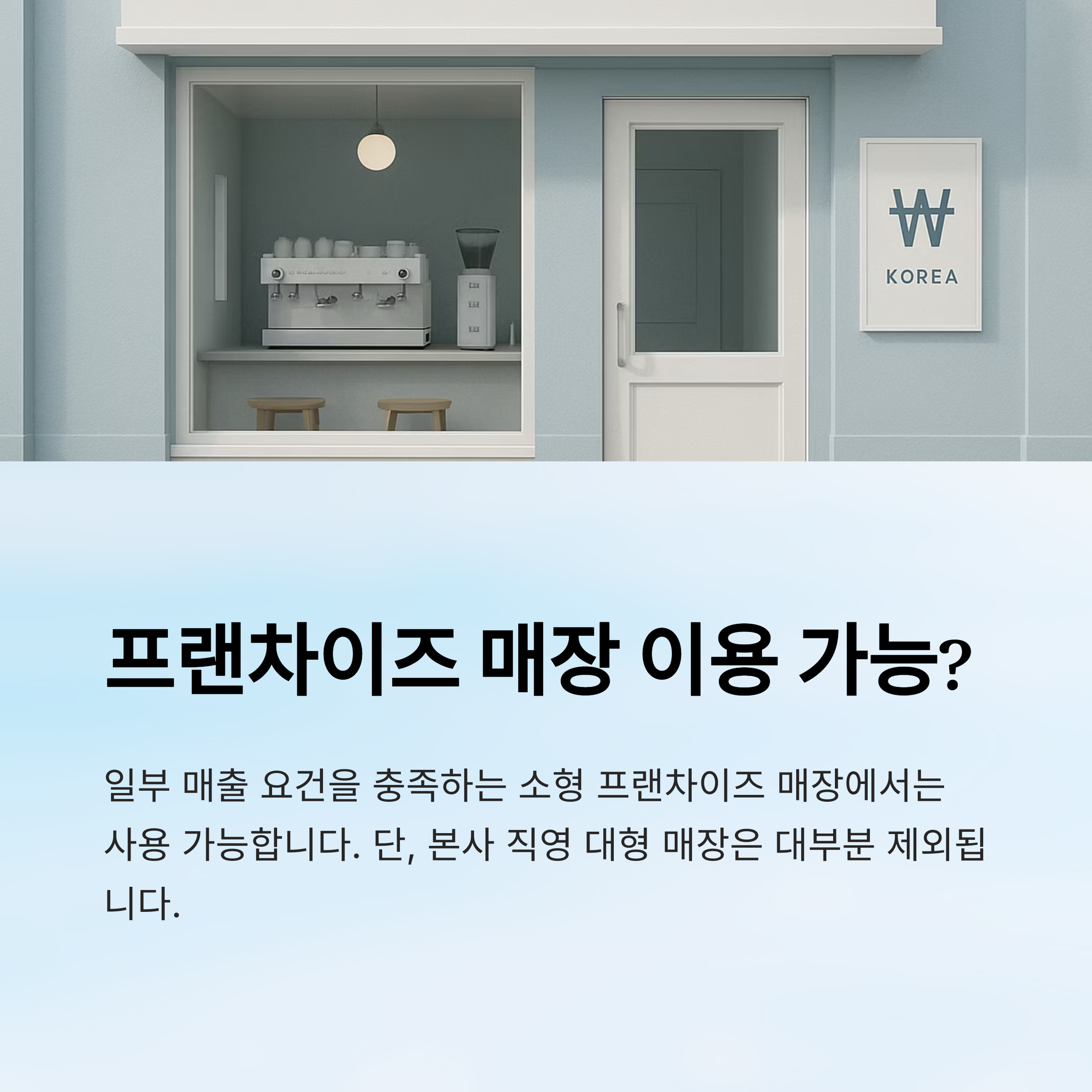 A2. 일부 매출 요건을 충족하는 소형 프랜차이즈 매장에서는 사용 가능합니다. 단, 본사 직영 대형 매장은 대부분 제외됩니다.