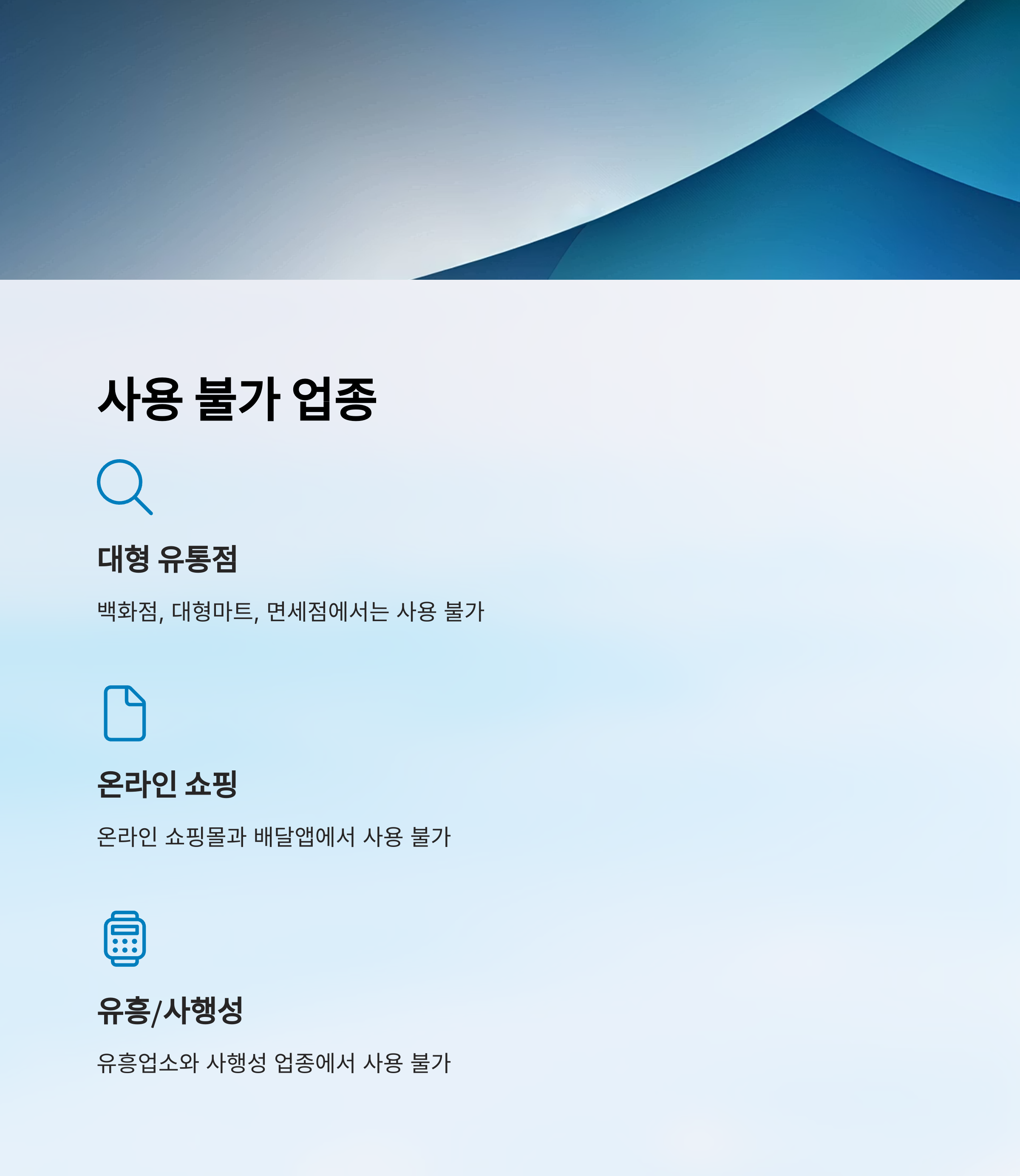| 사용 불가 업종 | 백화점, 대형마트, 온라인몰, 유흥업소 등 |