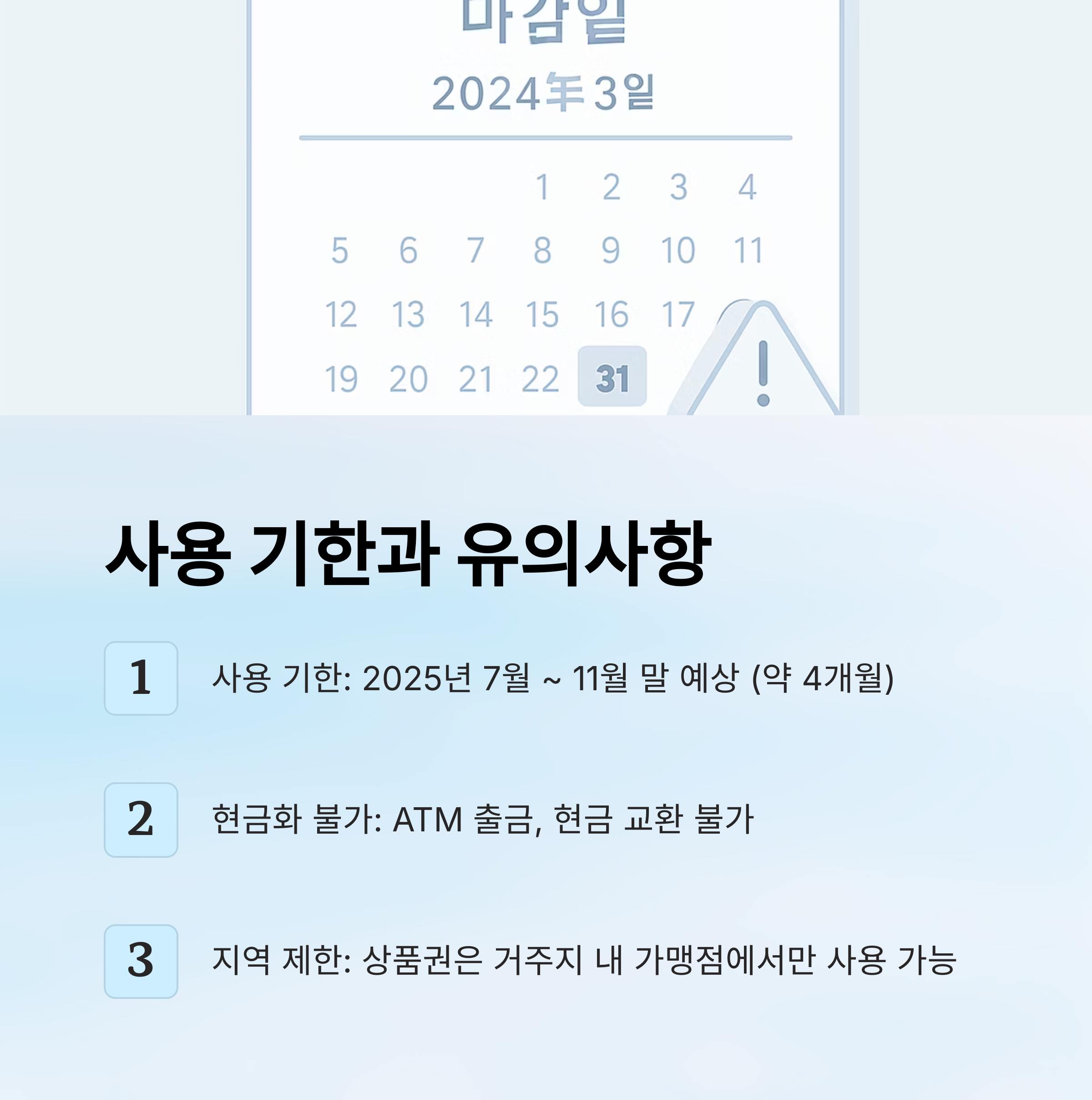 - 지역 제한: 상품권의 경우 거주지 내 가맹점에서만 사용 가능