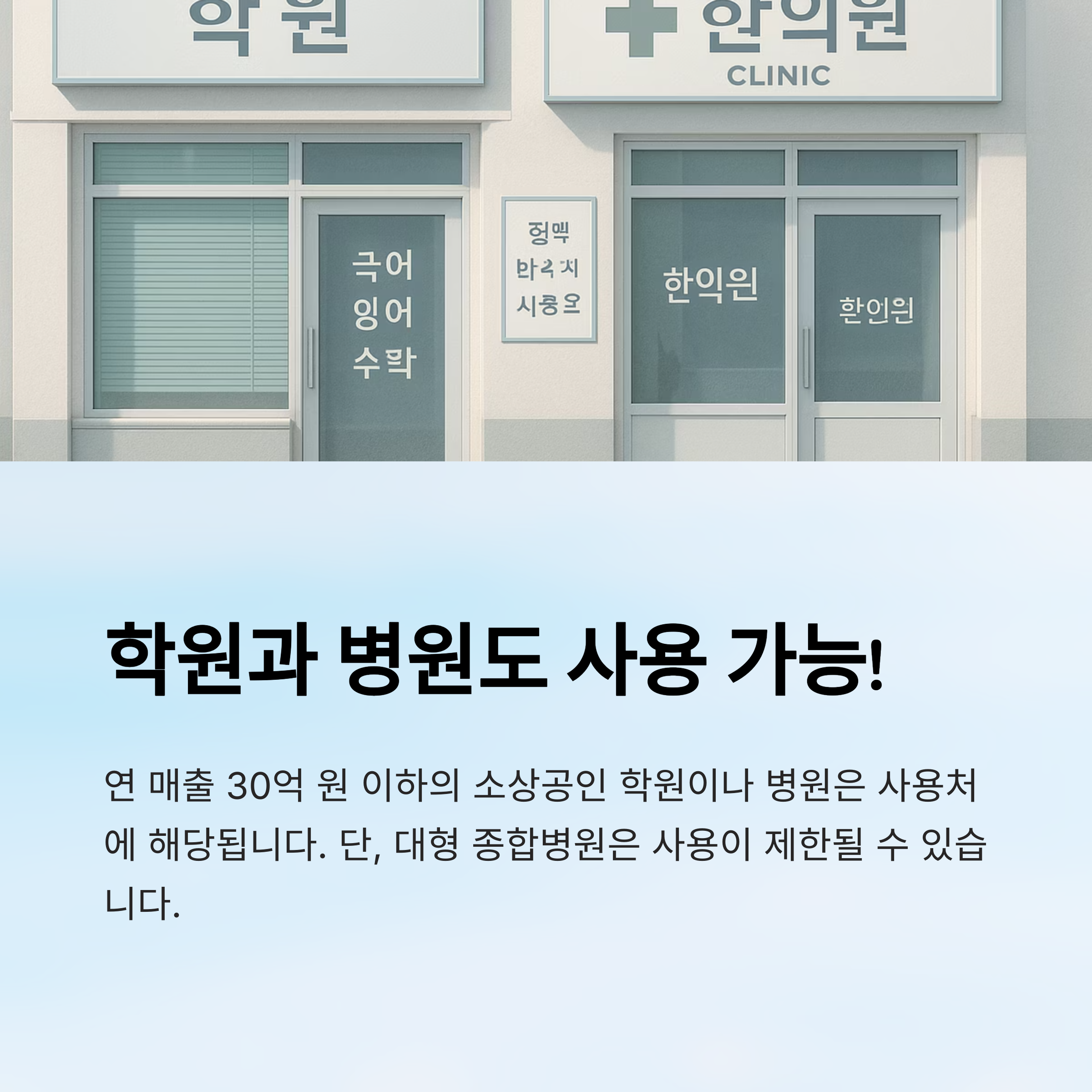 A3. 네, 연 매출 30억 원 이하의 소상공인 학원이나 병원은 사용처에 해당됩니다. 단, 대형 종합병원은 사용이 제한될 수 있습니다.