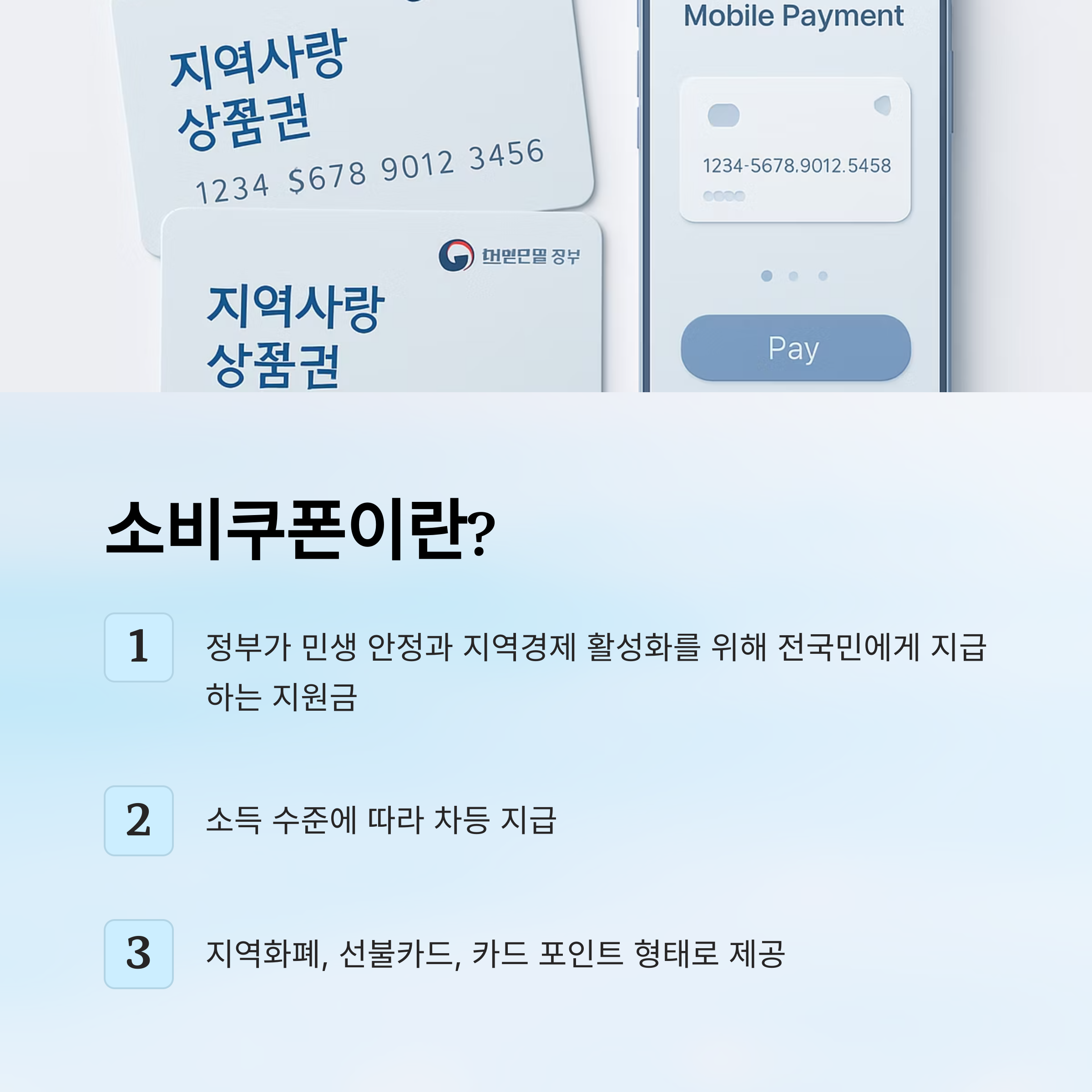 소비쿠폰은 정부가 민생 안정과 지역경제 활성화를 위해 전국민에게 지급하는 지원금입니다. 소득 수준에 따라 차등 지급되며, 지역화폐나 선불카드, 카드 포인트 등의 형태로 제공됩니다. 이때 가장 중요한 것은 전국민 소비쿠폰 사용처를 명확히 파악하는 것입니다.