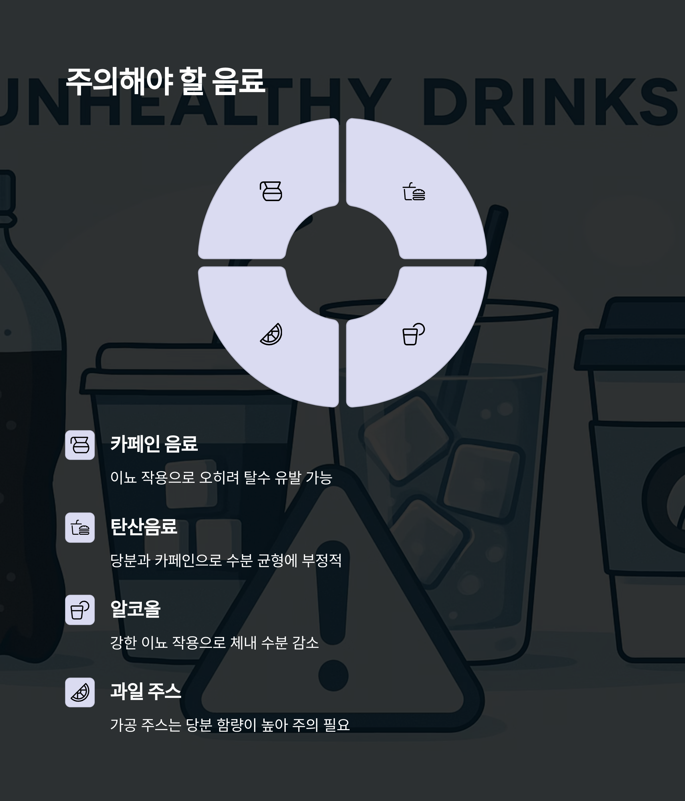 단, 카페인 음료나 단 음료는 이뇨 작용과 당분으로 인해 오히려 탈수를 유발할 수 있으니 주의가 필요합니다.