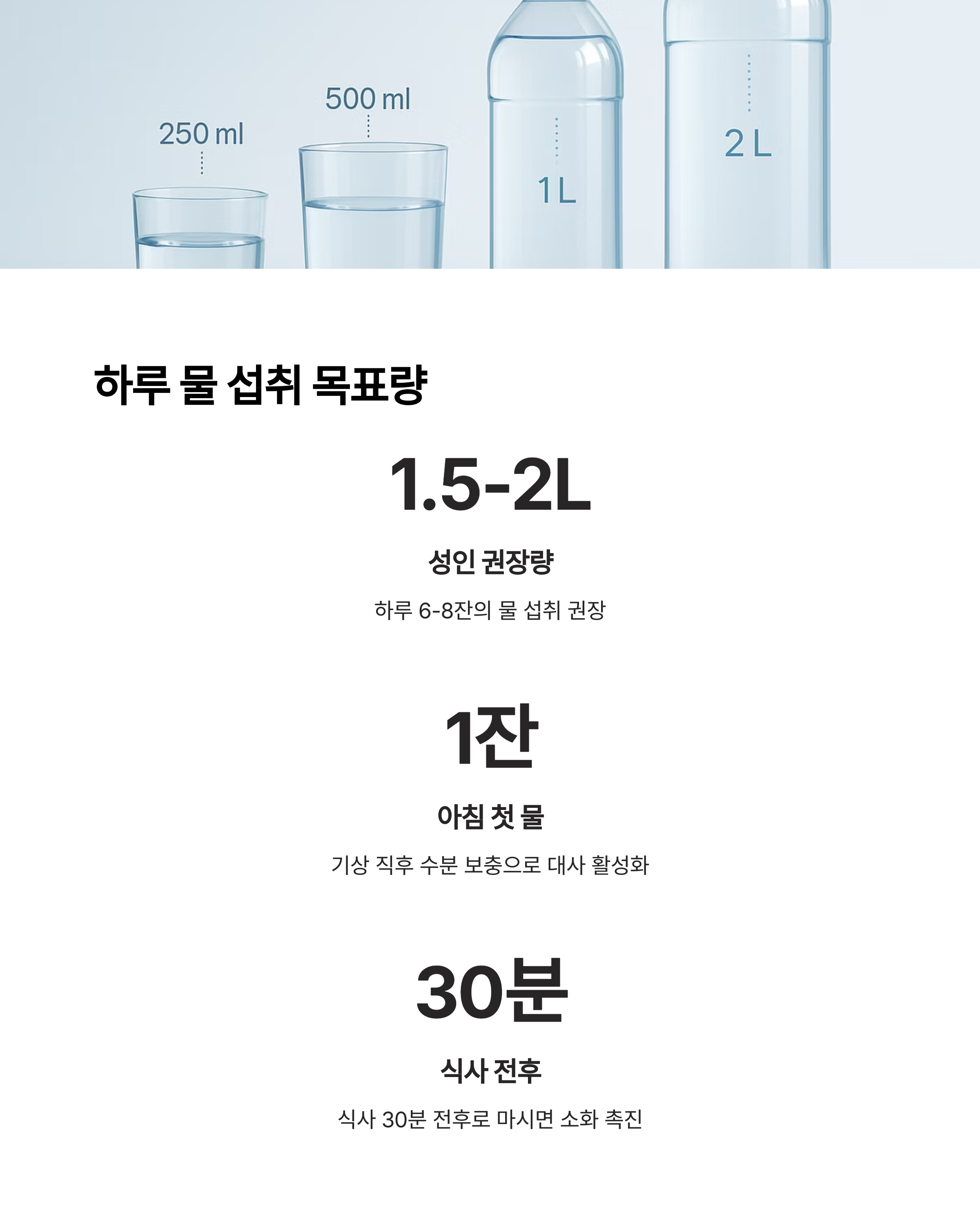 - 하루 6~8잔 이상 목표 : 일반적으로 성인은 하루 1.5L~2L의 물을 마시는 것이 권장됩니다.
