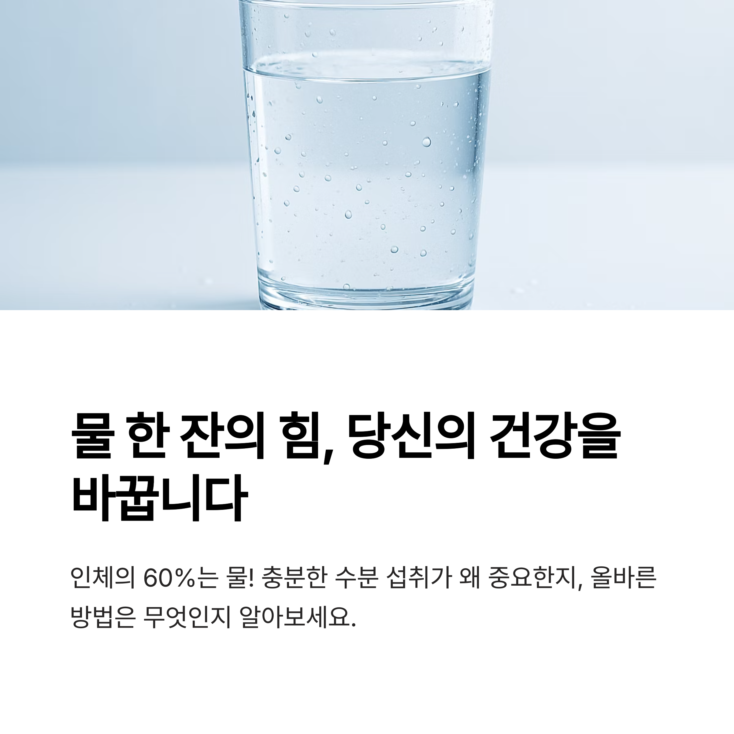 인체의 약 60%는 물로 구성되어 있습니다. 그만큼 수분은 생명 유지에 있어 필수 요소인데요, 충분한 수분 섭취는 신체 기능 유지뿐 아니라 일상 속 에너지와 집중력에도 큰 영향을 미칩니다. 이 글에서는 물을 충분히 마셔야 하는 이유와 올바른 수분 섭취법을 알아보겠습니다.