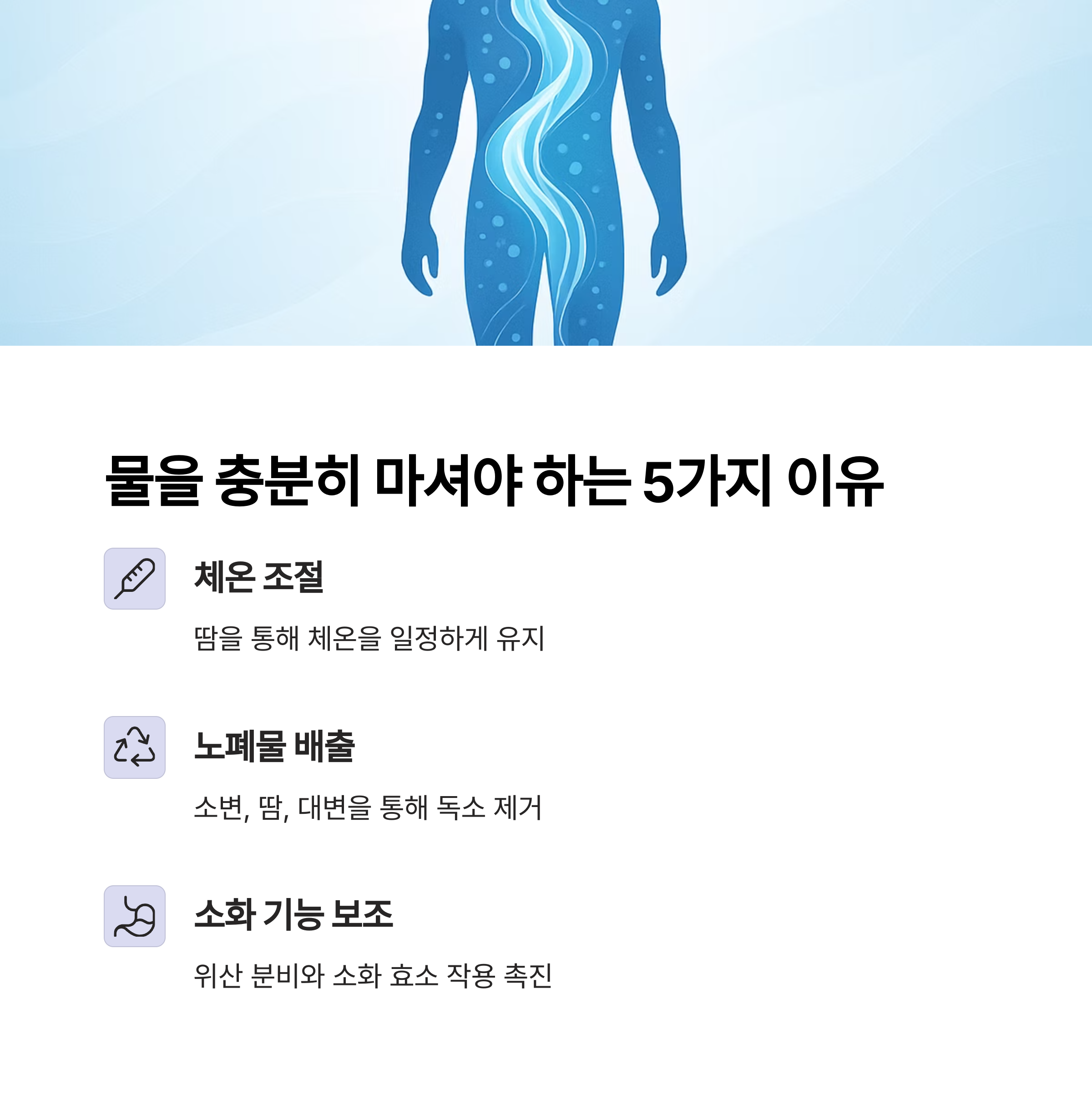 - 체온 조절 : 물은 땀을 통해 체온을 일정하게 유지시켜 줍니다.