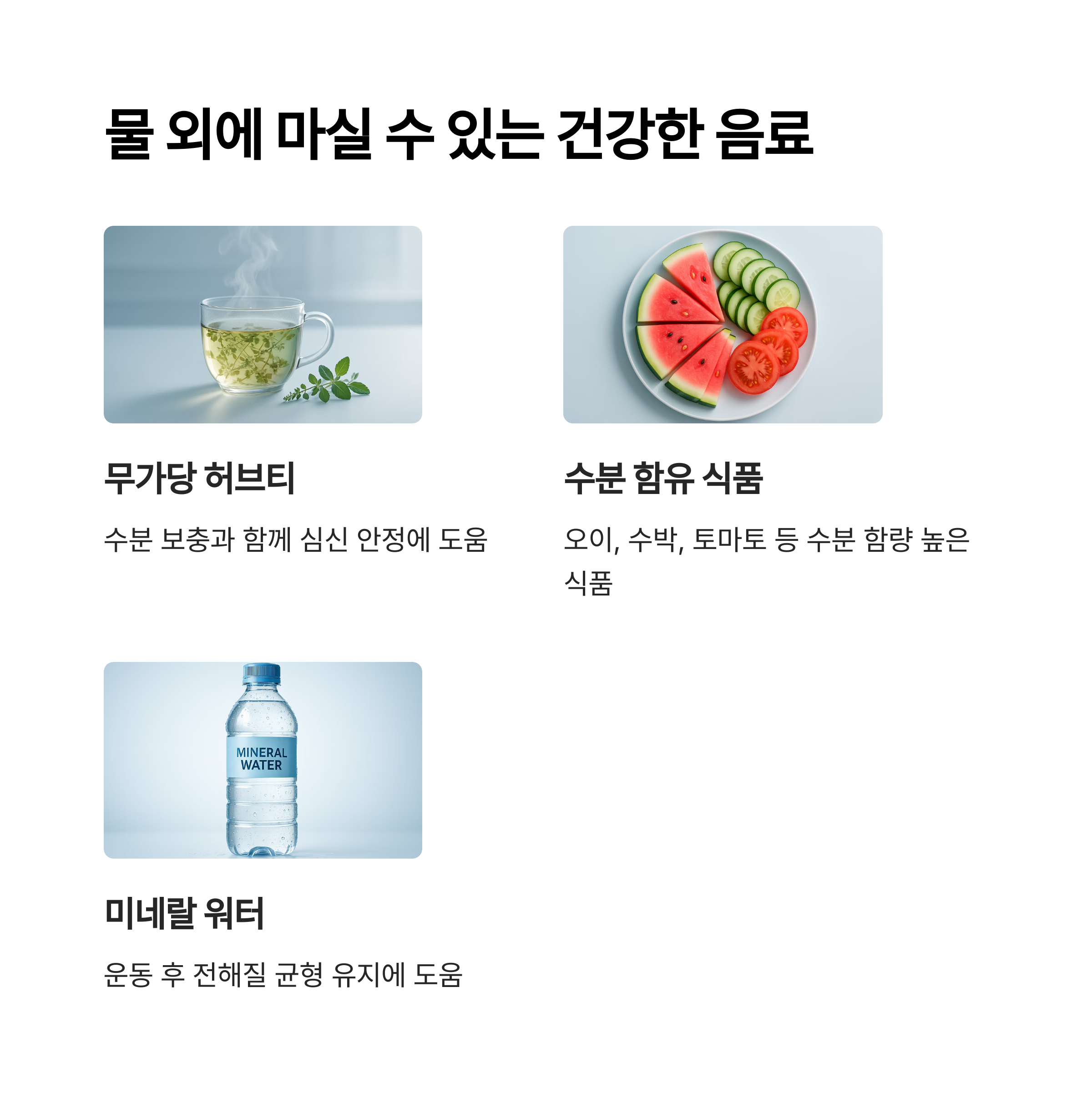 물 외에도 수분을 보충할 수 있는 건강한 음료들이 있습니다.