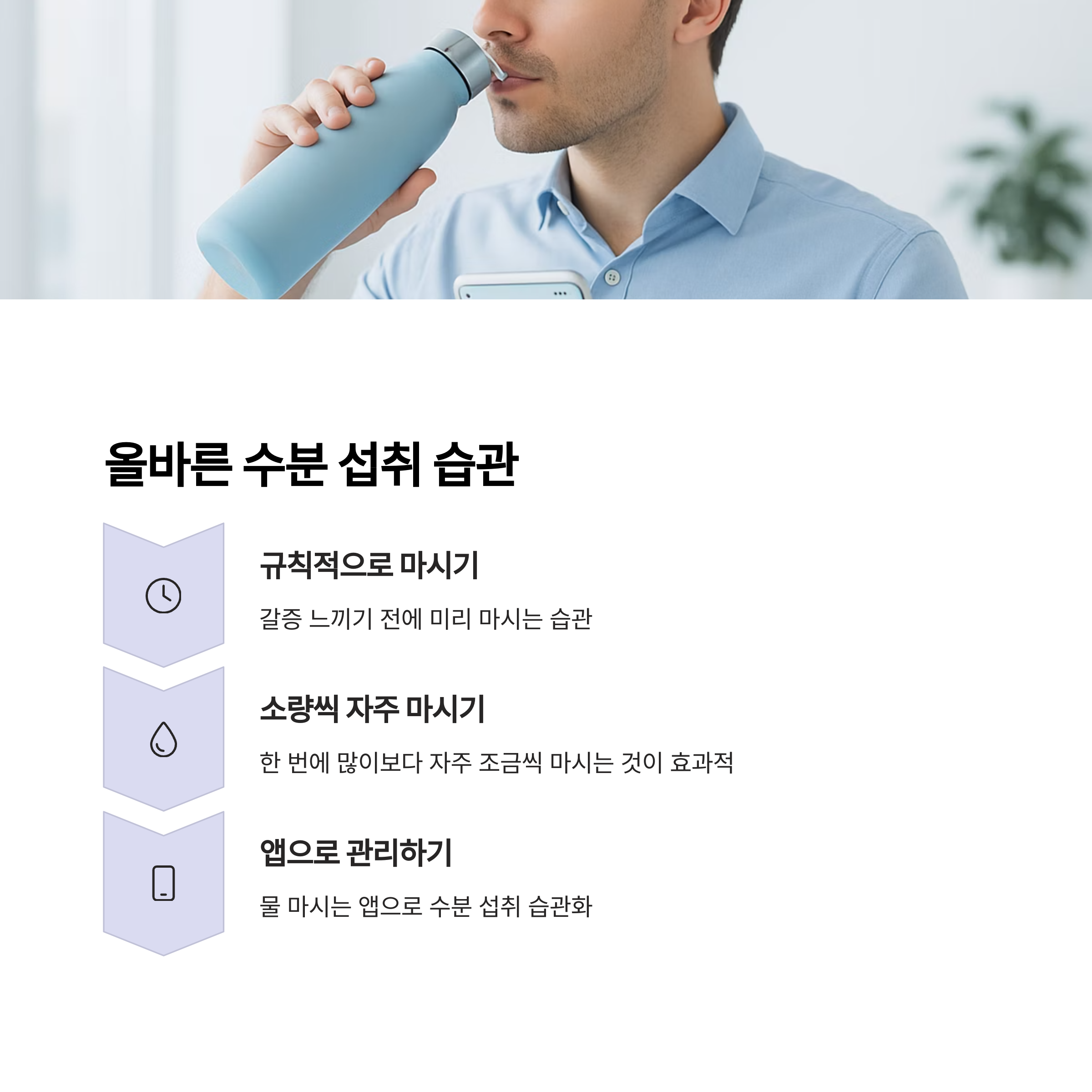 - 앱이나 물병으로 습관화 : 전용 물병이나 물 마시는 앱을 활용하면 꾸준히 실천하기 좋습니다.