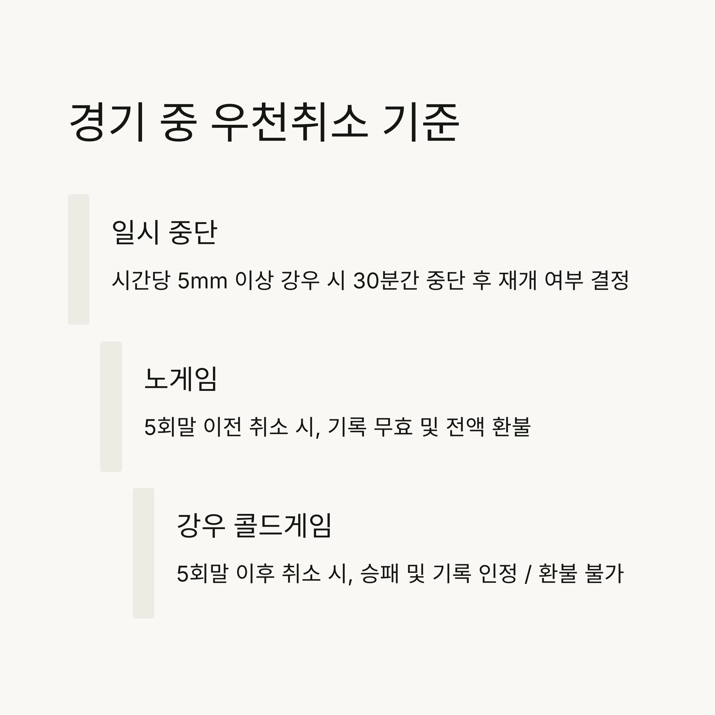 - 경기 시작 3시간 전: 시간당 10mm 이상 강우 시 취소 고려