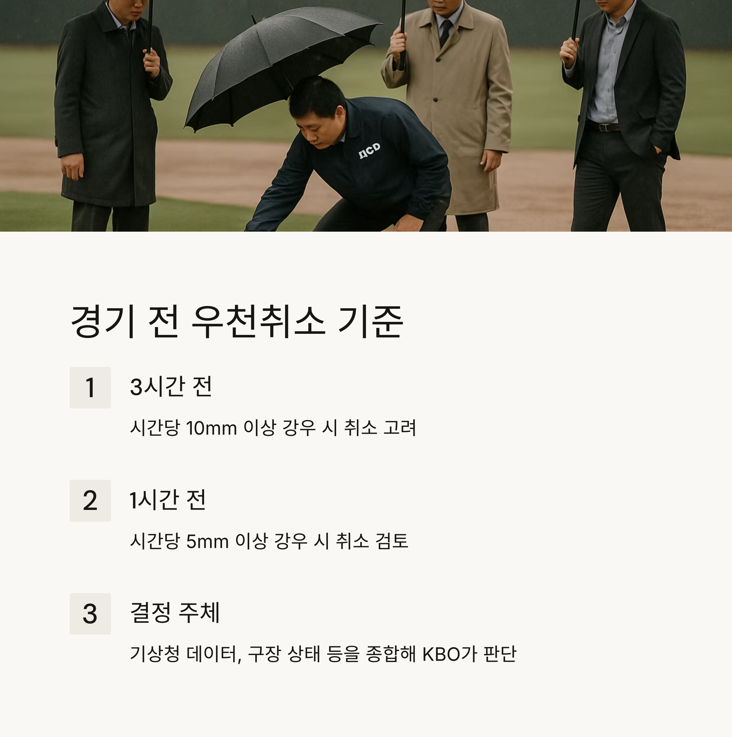 - 결정 주체: 기상청 데이터, 구장 상태 등을 종합해 KBO가 판단