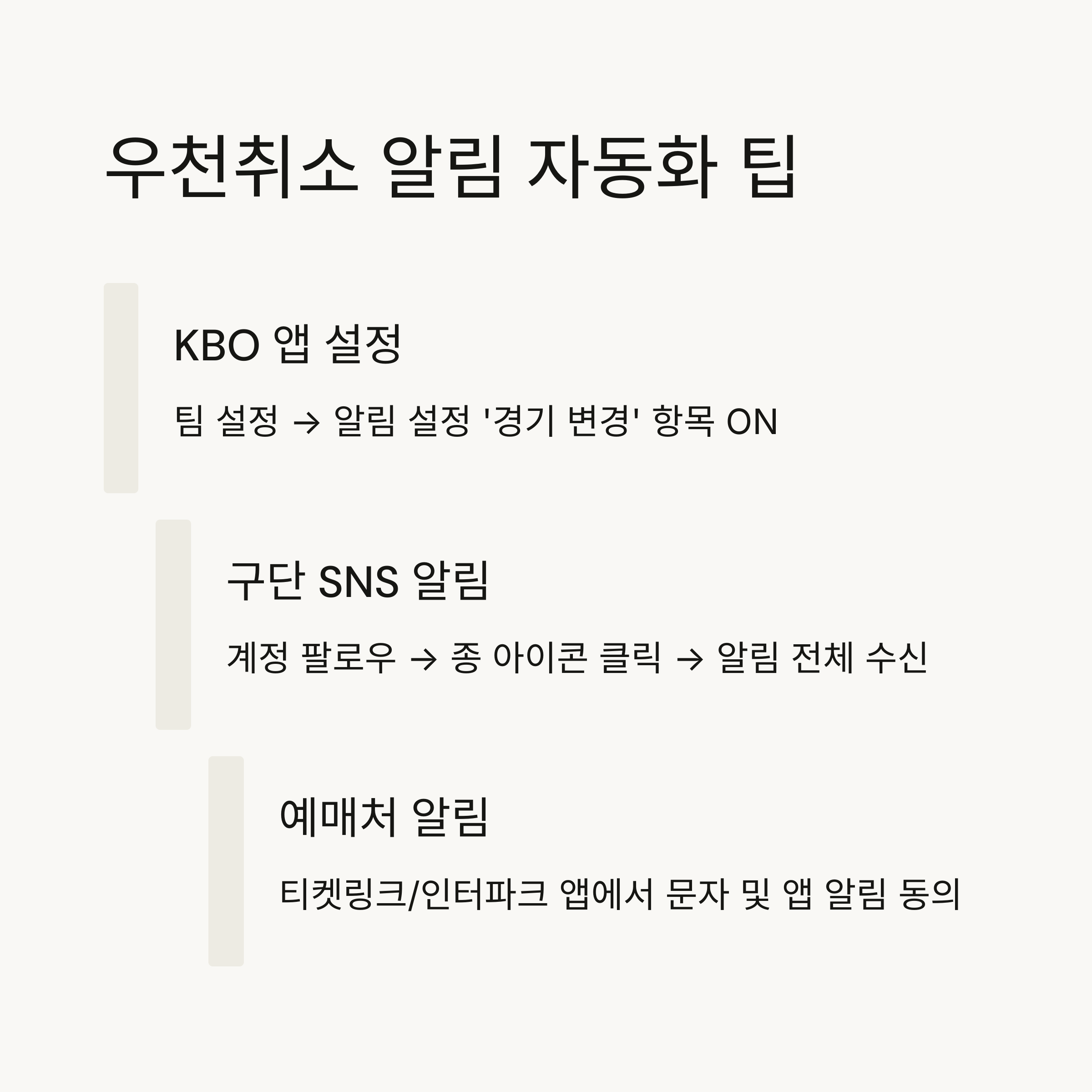 - KBO 앱: 팀 설정 → 알림 설정 ‘경기 변경’ 항목 ON