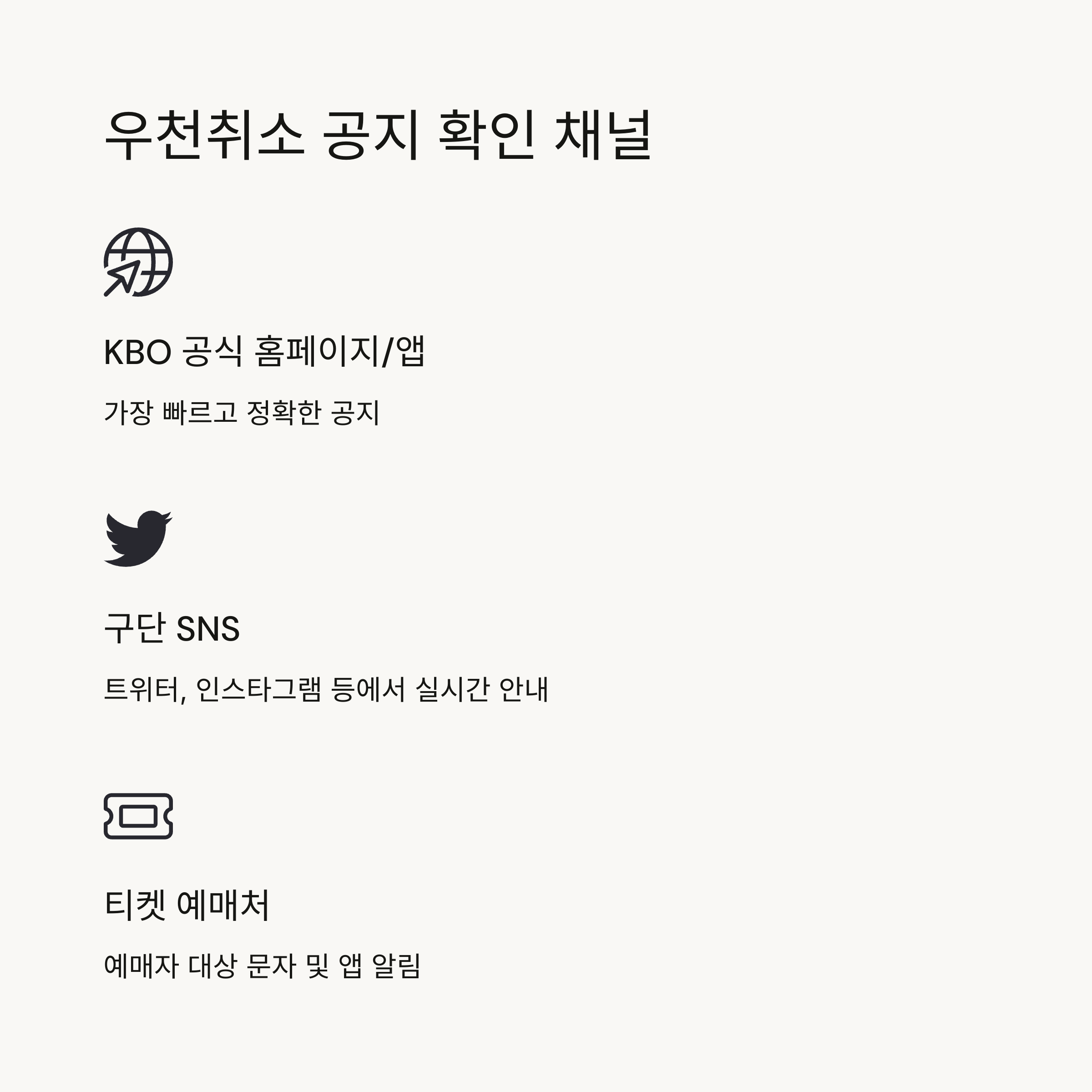 | 공지 채널 | KBO 앱, 구단 SNS, 예매처, 현장 안내방송 |
