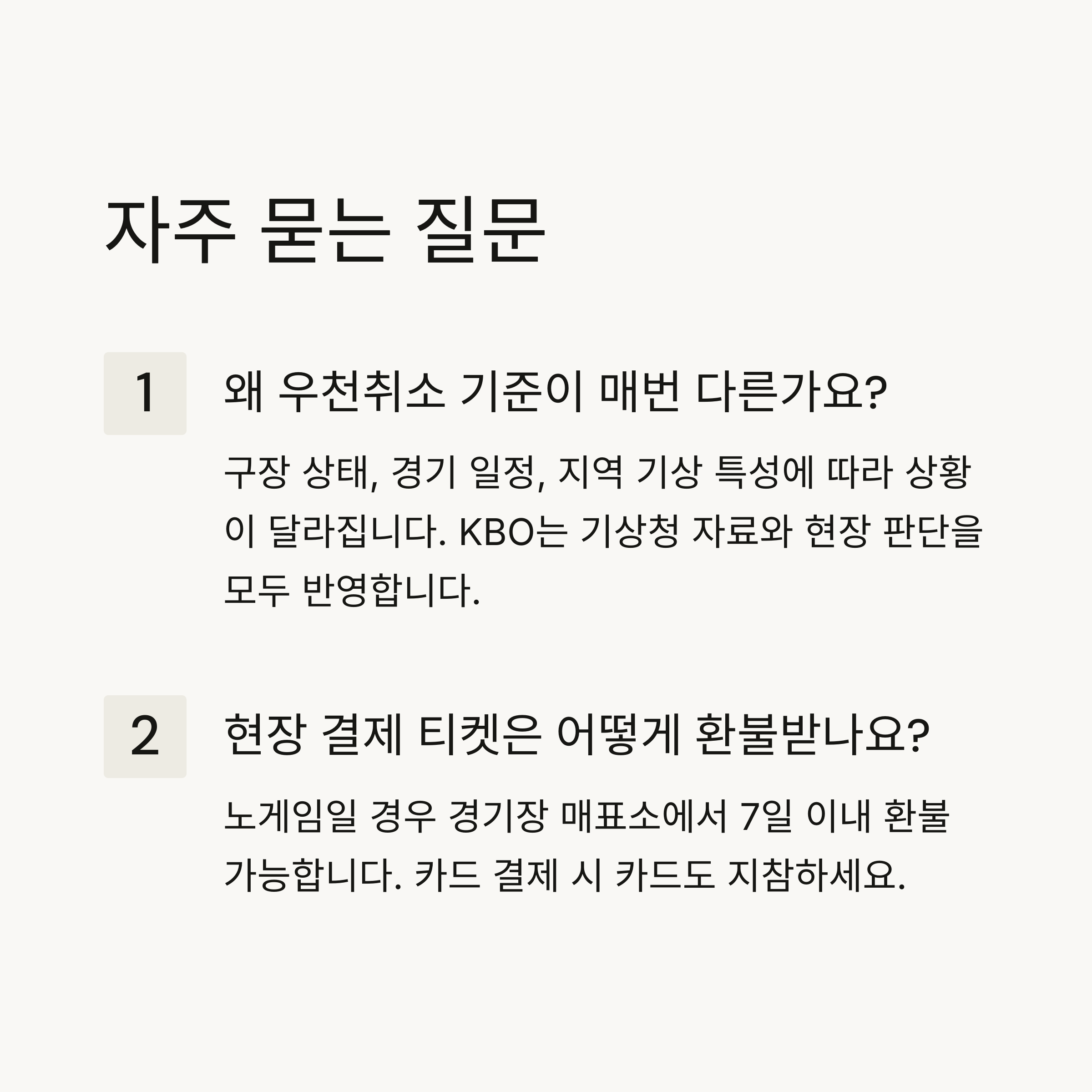A1. 같은 비가 와도 구장 상태, 경기 일정, 지역 기상 특성 등에 따라 상황이 다를 수 있습니다. KBO는 기상청 자료와 현장 판단을 모두 반영해 결정합니다.