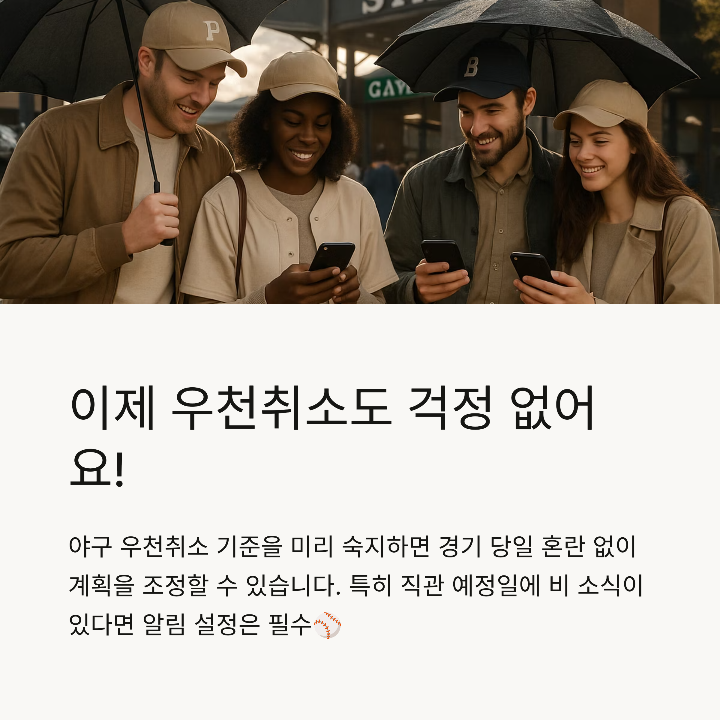 직관을 계획 중인데 경기 당일 비 예보가 있다면 가장 먼저 떠오르는 고민은 "오늘 야구 경기 열릴까?"입니다. 야구 우천취소 기준은 단순한 기상 상황이 아닌 정해진 규정에 따라 판단되며, 환불 여부도 경기 상황에 따라 달라집니다. 이 글에서는 야구 우천취소 기준부터 공지 확인 방법, 환불 규정, 자동 알림 팁까지 한눈에 정리해드립니다.