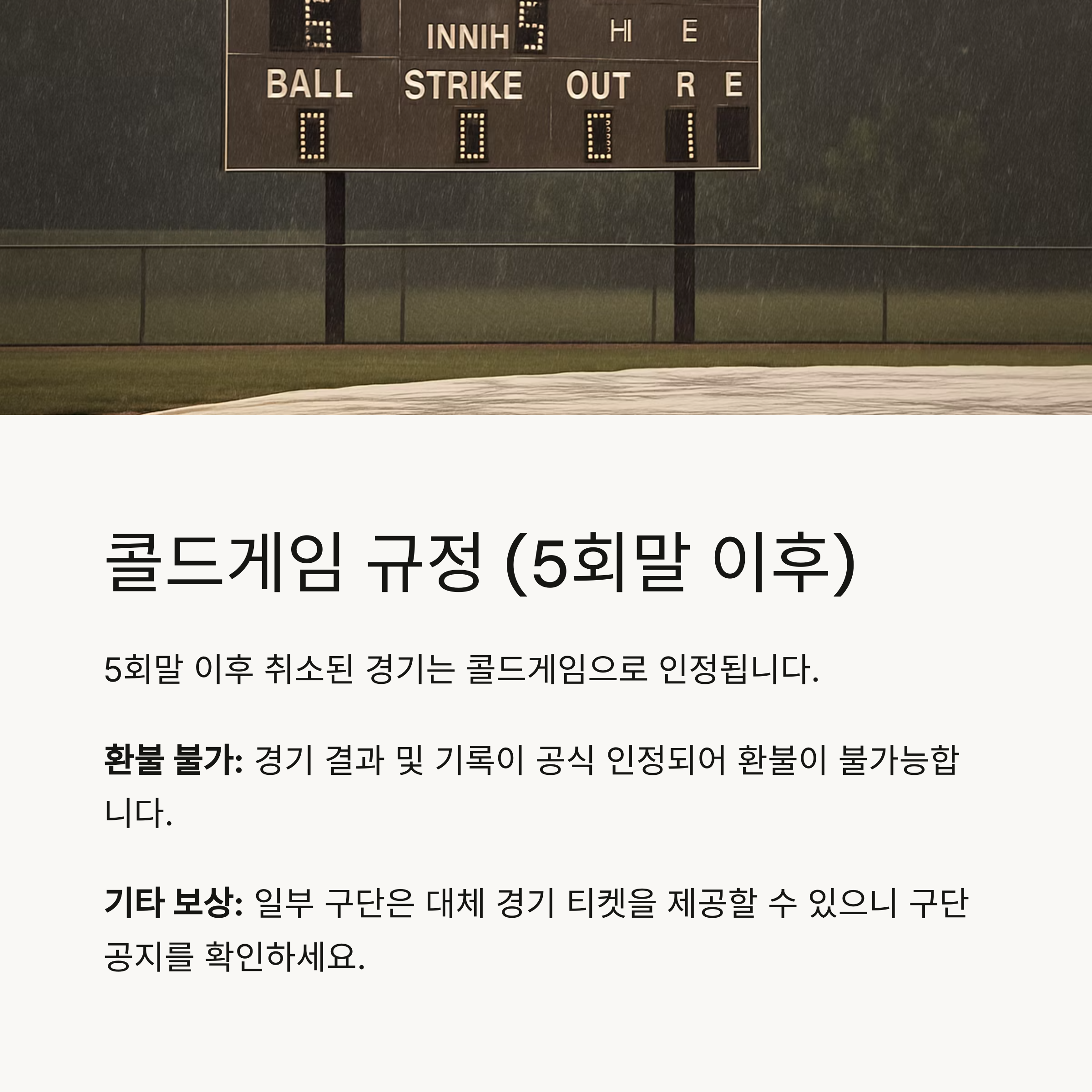 - 강우 콜드게임: 5회말 이후 취소 시, 승패 및 기록 인정 / 환불 불가